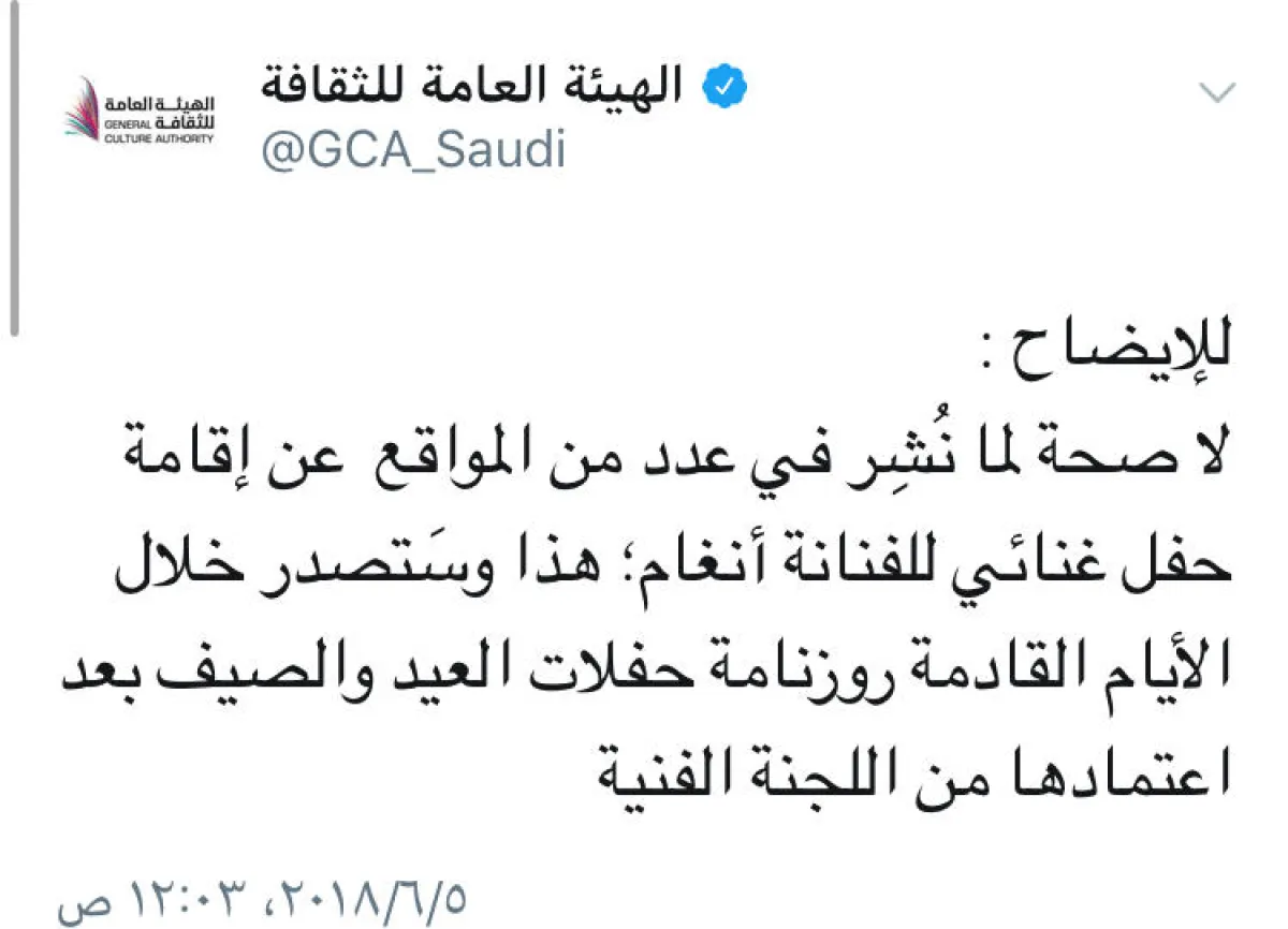 الهيئة العامة للثقافة في السعودية نشرت تغريدة عبر حسابها بموقع "تويتر"، لنفي إقامة حفل للمطربة المصرية أنغام، ثاني أيام عيد الفطر، وقالت: "للإيضاح لا صحة لما نُشِر في عدد من المواقع عن إقامة حفل غنائي للفنانة أنغام؛ هذا وستصدر خلال الأيام المقبلة روزنامة حفلات العيد والصيف، بعد اعتمادها من اللجنة الفنية".