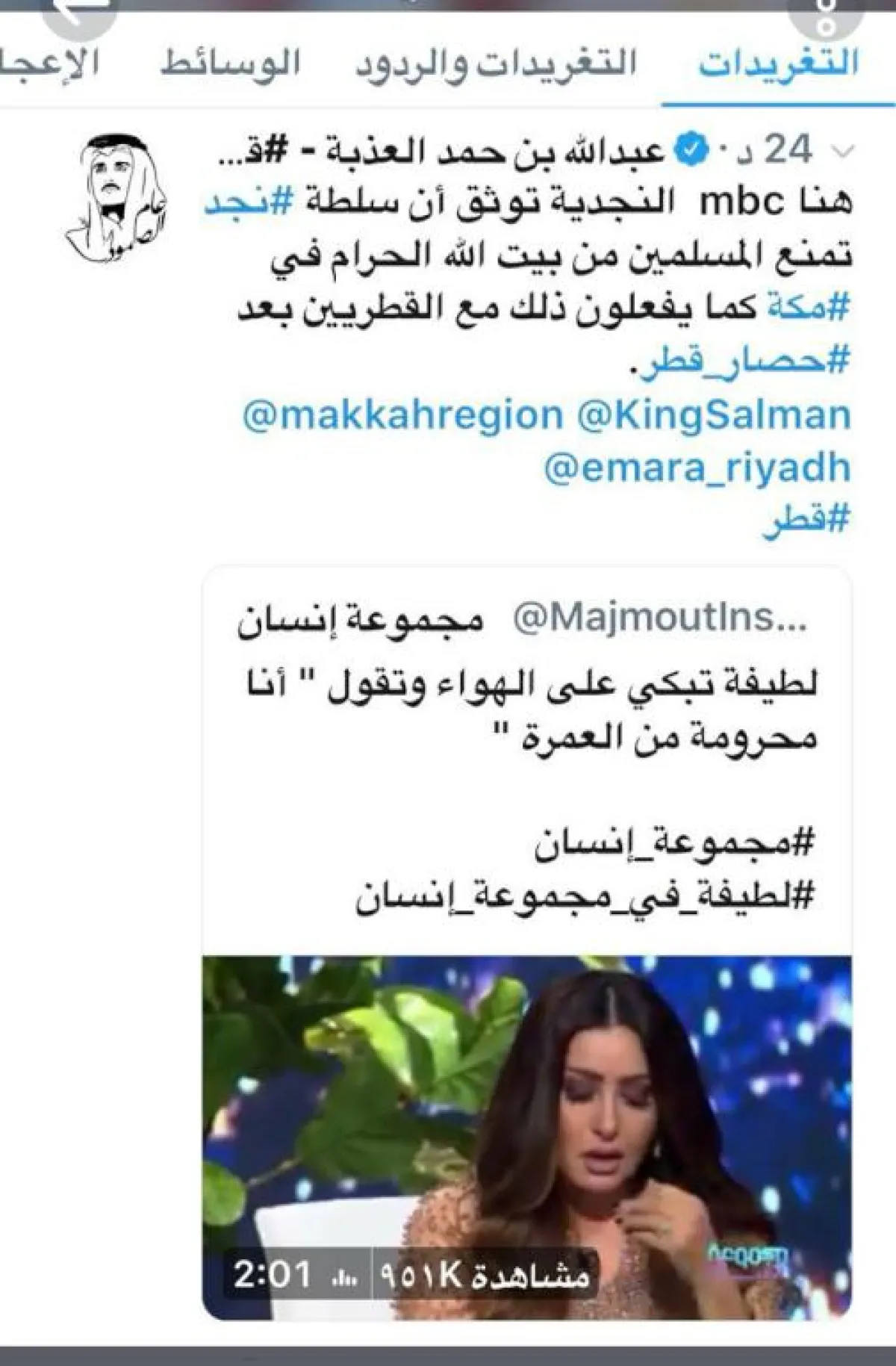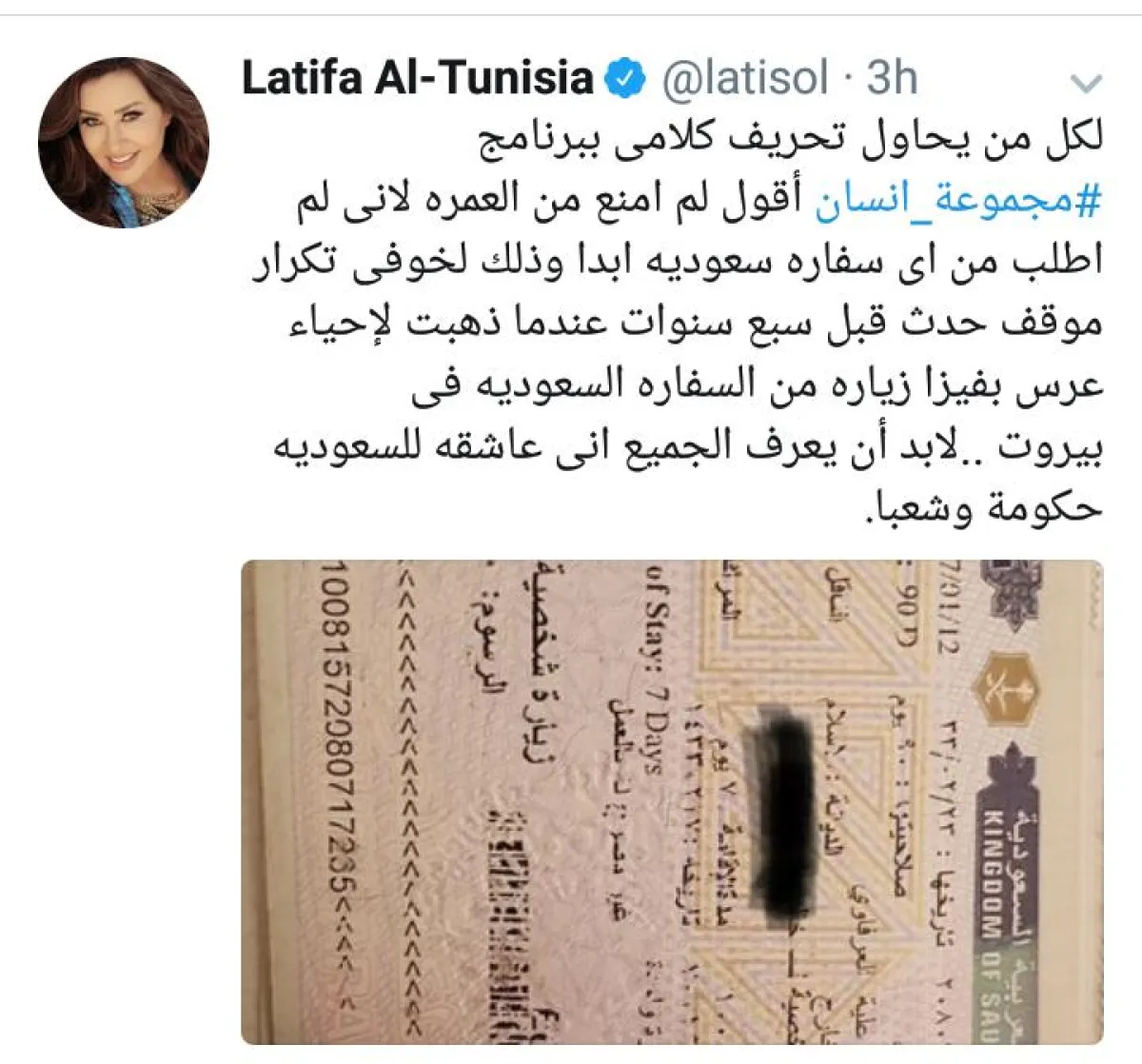 لطيفة نشرت صورة عن الفيزا التي كانت قد حصلت عليها من السفارة السعودية في بيروت قبل سبع سنوات، وغردت عبر حسابها على "تويتر": "أقول لم أُمنع من العمرة لأنني لم أطلب من أيّ سفارة سعودية أبدًا، وذلك لخوفي من تكرار موقف حدث قبل سبع سنوات، عندما ذهبت لإحياء عرس بفيزا زيارة من السفارة السعودية في بيروت. لا بد أن يعرف الجميع أنني عاشقة للسعودية حكومةً وشعبًا".