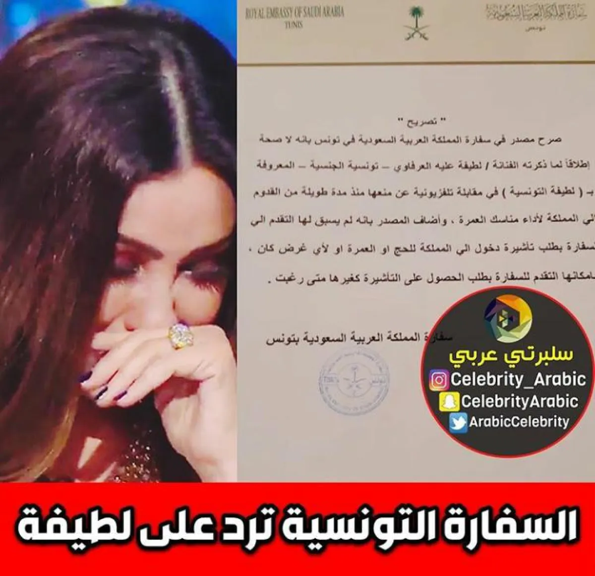 وكانت السفارة السعودية في تونس قد اكدت أنه لم يسبق للفنانة لطيفة أن تقدمت بطلب أداء العمرة، عبر إيضاح جاء فيه: "المواطنة التونسية لطيفة علي العرفاوي والتي ظهرت في مقابلة تلفزيونية وادّعت منعها من القدوم إلى المملكة لأداء مناسك العمرة، بأنها لم يسبق لها التقدم بطلب تأشيرة للحج أو العمرة".
