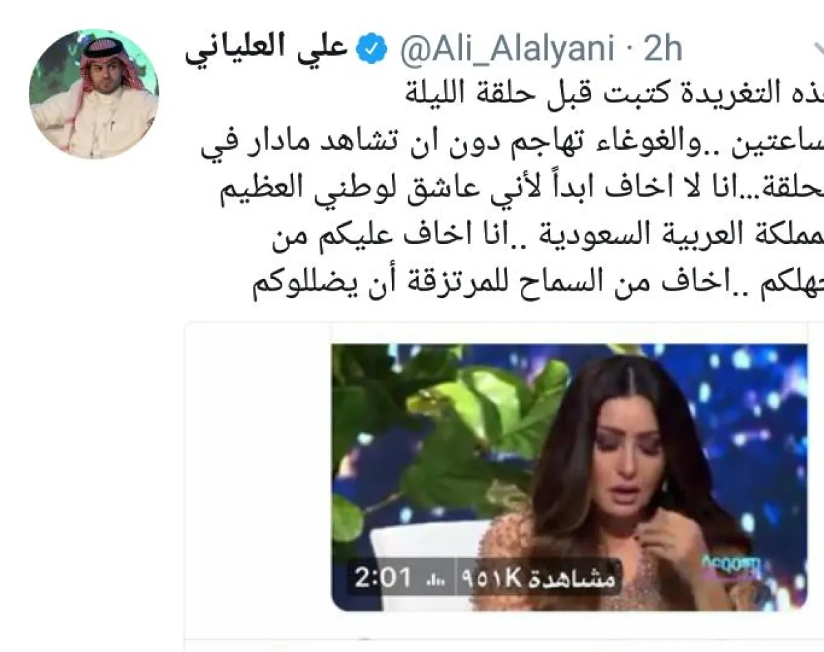 أما علي العلياني فأوضح حقيقة موقفه مما حصل، عبر تغريدة ربطت بين ما قالته لطيفة عن منعها من دخول السعودية، وتغريدة أخرى تشير الى أنّ السعودية تمنع المسلمين من زيارة بيت الله الحرام، وكتب: "هذه التغريدة كُتبت قبل حلقة الليلة بساعتين ..والغوغاء تهاجم من دون أن تشاهد ما دار في الحلقة...أنا لا أخاف أبدًا لأني عاشق لوطني العظيم المملكة العربية السعودية ..أنا أخاف عليكم من جهلكم.. أخاف من السماح للمرتزقة أن يضللوكم أنه تم نشر التغريدة الخاصة بمنع لطيفة من دخول السعودية".