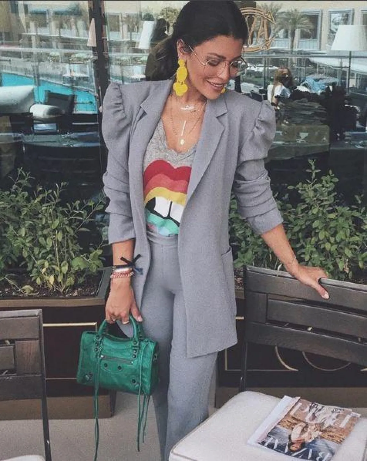 مع صيحة البدل الأنيقة باللون الرمادي، أكملت الفاشنيستا العنود بدر إطلالتها بحقيبة صغيرة من الجلد، باللون الأخضر، و تحمل بيد طويلة أو قصيرة، اختارت العنود اليد الطويلة.