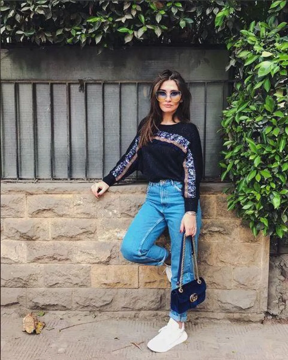 أعجبنا اختيار مدونة الموضة المصرية شنطة غوتشي Gucci الفيلفت باللون الأحمر، باليد المعدنية الذهبية، مع إطلالتها الكاجوال بالجينز ال High Waist، وبلوزة عصرية، وحذاء رياضي باللون الأبيض.