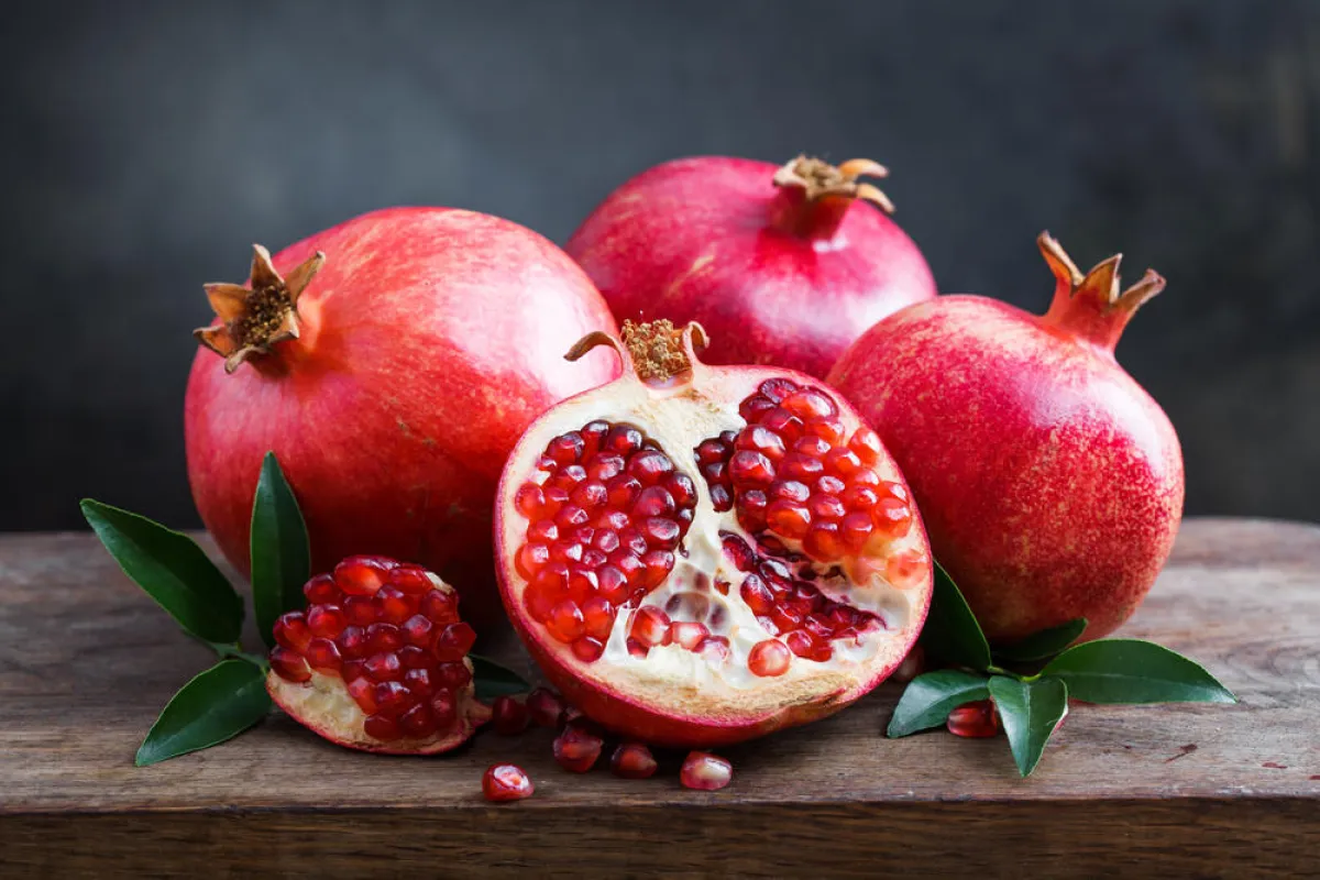 | الرمَّان: تعدُّ بذور الرمَّان من المواد الغنيَّة بالألياف والفيتامين "ج" والفيتامين "ك" والبوتاسيوم. وهي غنيَّة أيضًا بمضادات الأكسدة. وعمومًا، يُفضَّل تناول الحبوب كاملة عوضًا عن العصير من أجل الاستفادة من الألياف فيها.