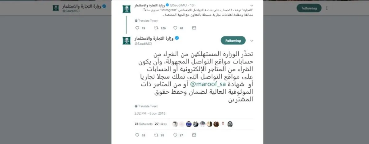 وقد قامت الوزارة مؤخرًا بتوقيف وإغلاق 11حسابًا على منصّة التواصل الاجتماعي "Instagram"، تُسوّق سلعًا مخالفة ومُقلّدة لعلامات تجارية مُسجَّلة، بالتعاون مع الجهة المختصة.