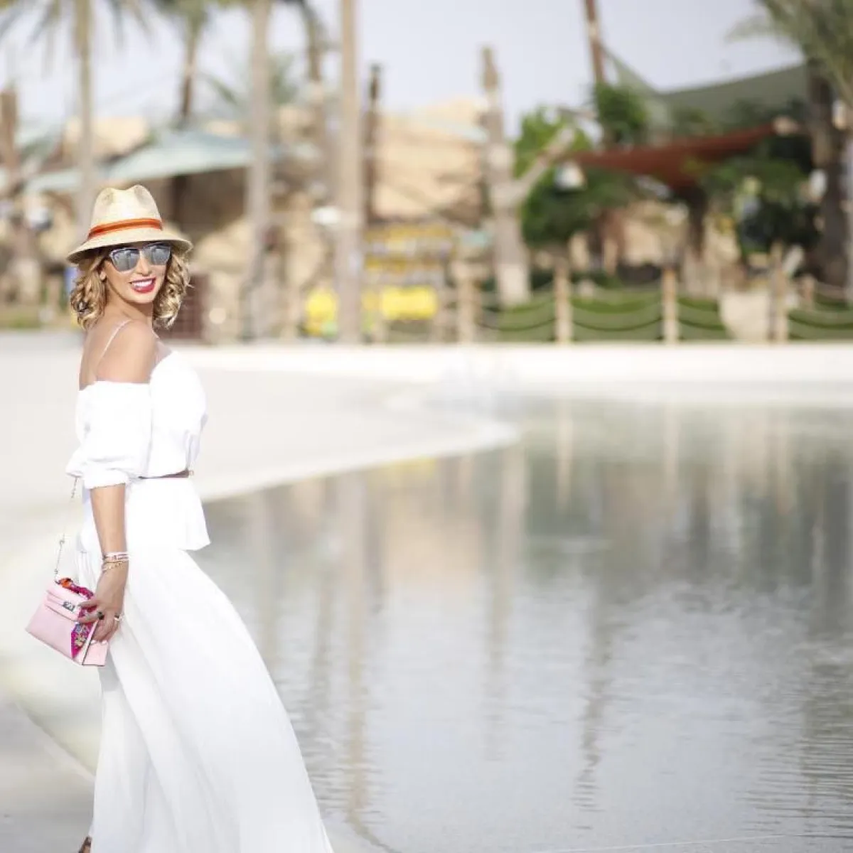 تُحب جويل قطع الصيف كثيرًا، مثلما لفتنا إطلالتها باللون الأبيض الزاهي بالبنطلون الواسع جدًا بخامة الشيفون، مع التوب الأوف شولدر الناعم، وقبعة الرأس الخوص، وحقيبة أنيقة باللون الزهري.