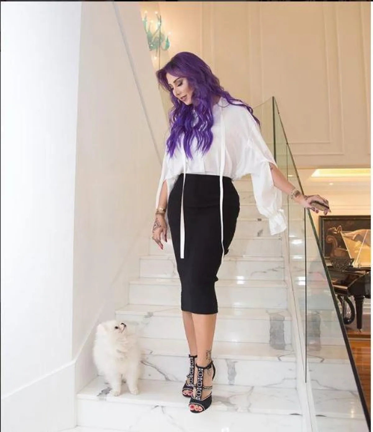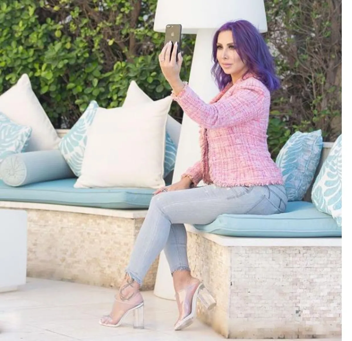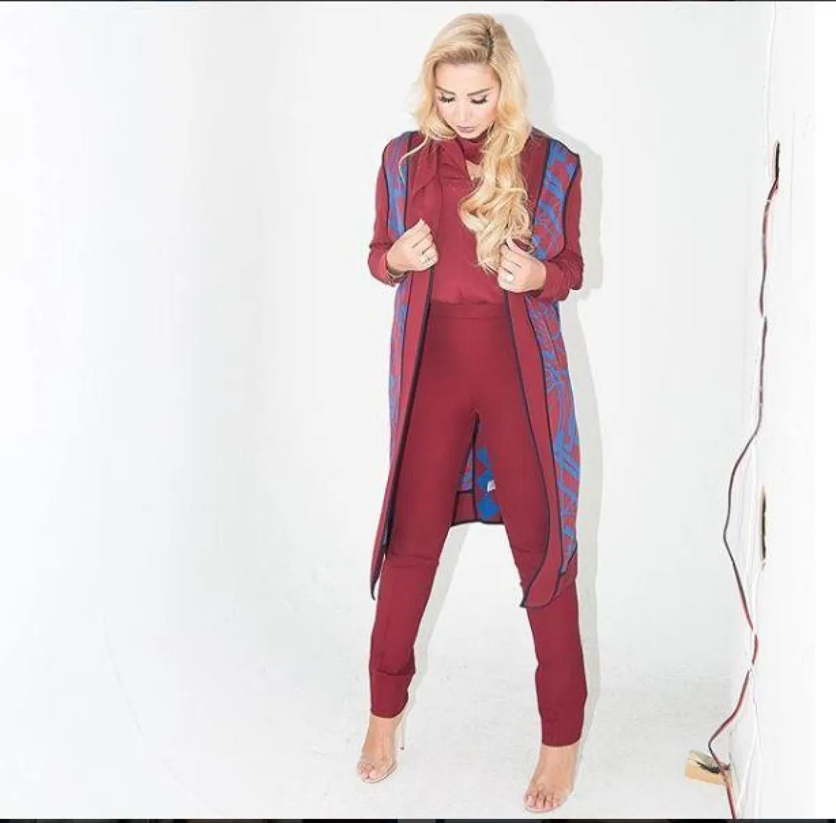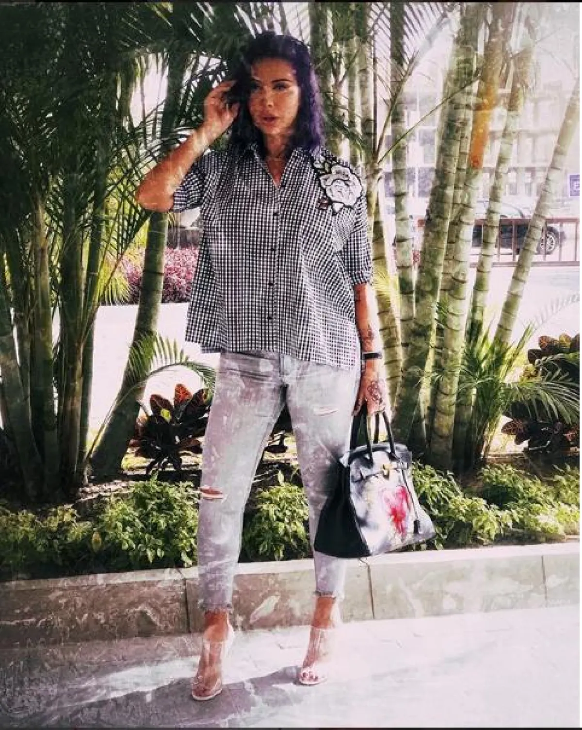 لفتنا تنسيق جويل للجينز العصري، باختيار البنطلون ذو الخصر العالي High waist مع حزام الخصر ليمنحها رشاقة، والجينز بلون فاتح قليلًا عن البنطلون، واختارت معهم كعب عالي باللون الأسود مع أحجار لامعة.