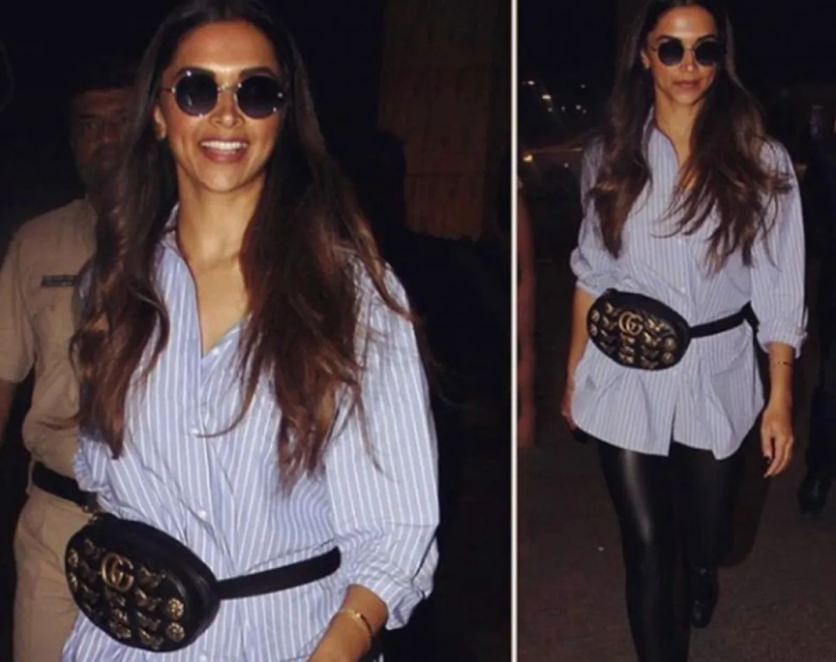اختارت نجمة بوليوود Deepika Padukone شنطة يد من غوتشي Gucci أيضًا، مع قميص صيفي مخطط بالطول باللون اللبني الفاتح، وارتدت بنطلونًا من الجلد، ونظارة كاجوال.