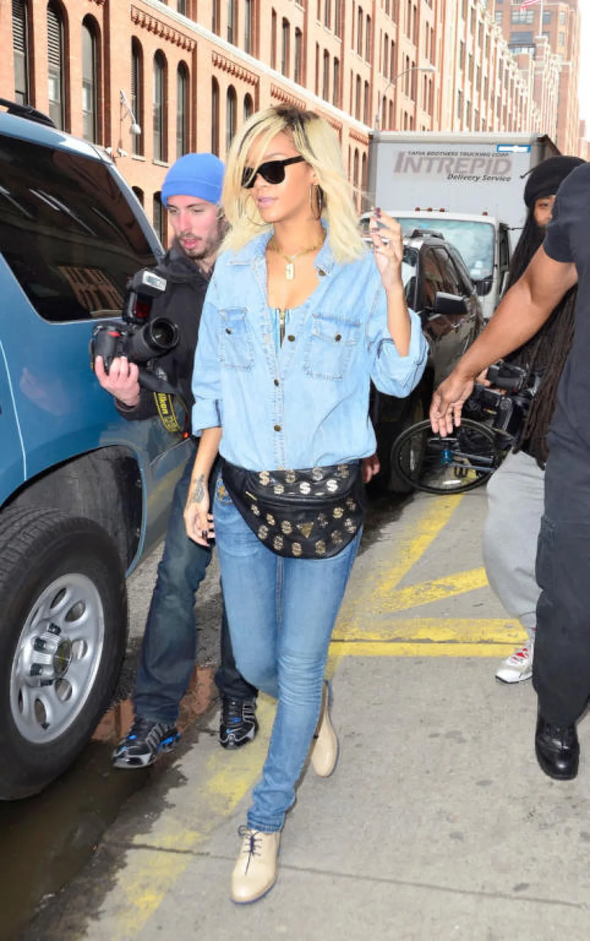 ظهرت بها كذلك نجمة البوب العالمية ريهانا Rihanna بإطلالة الدنيم، إذ ارتدت قميصًا وبنطلونًا من الجينز، مع حقيبة حزام باللون الأسود، مزينة برسومات ذهبية صغيرة.