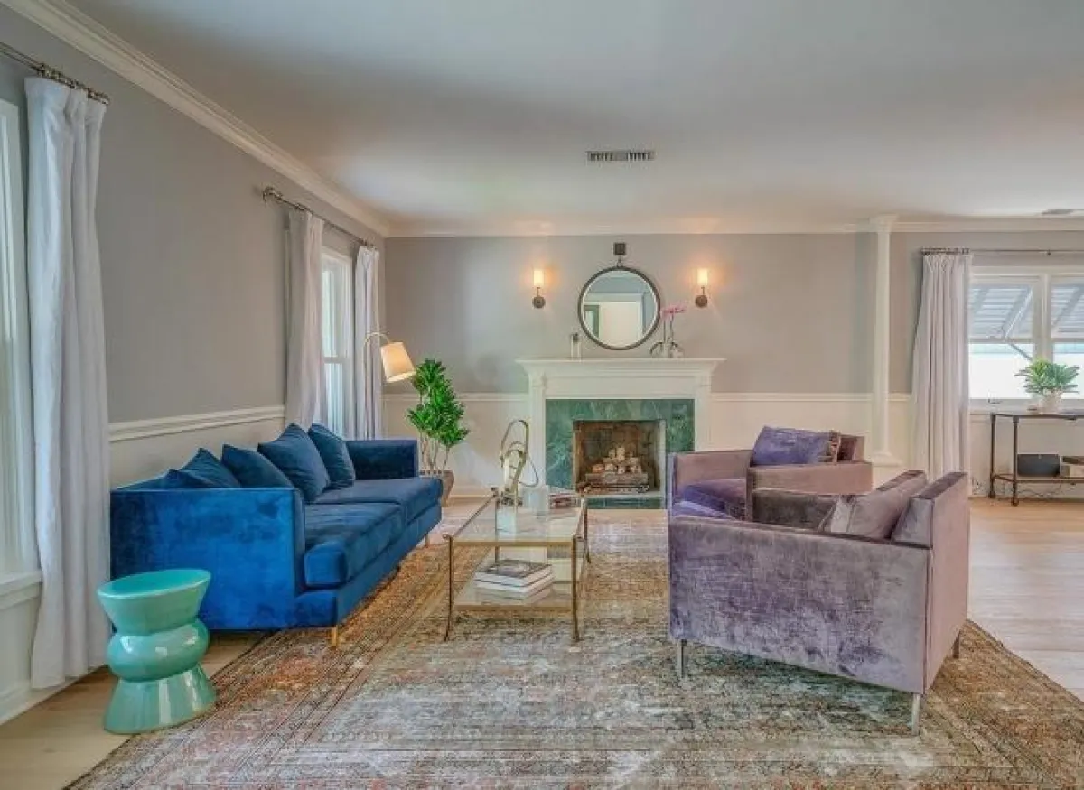 في الصالون الرئيس، تمتزج الألوان، التي تضفي طابعًا جدِّيًّا في الأرجاء، إذ يحلُّ الأزرق النيلي على الأريكة الرئيسة، ويواجهها مقعدان مكسوَّان بالمخمل بلون البنفسج اللمَّاع. ويمدُّ الأخضر بساطه في المساحة من خلال الشتول الطبيعيَّة وأعمال الرخام التي تحوط واجهة المدفأة والطاولة الجانبيَّة.