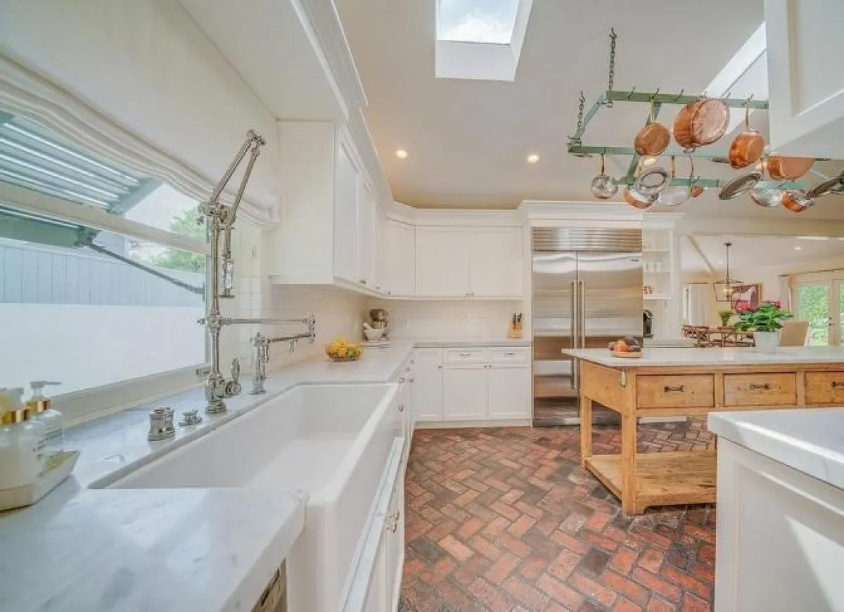يتبع المطبخ الرحب من جهته، الطراز الريفي في تفاصيله المتقنة، حيث يتوزَّع فيه الخشب الأبيض الذي ترتديه الخزائن. واللافت هو الأواني النحاس المُستعملة في الطبخ، التي تتدلَّى من السقف فوق "الجزيرة" الخشب توفيرًا للمساحة، في محاكاة للطراز الريفي.