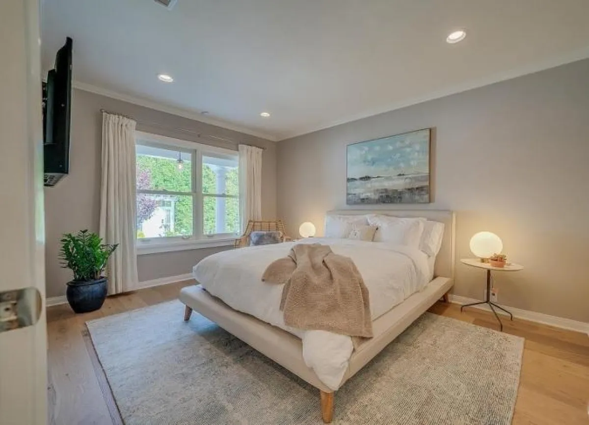 في غرفة النوم الرئيسة البعيدة كل البُعد عن التكلُّف، يطغى البيج على مكوِّناتها، ما يطبعها بالهدوء والراحة، وذلك بمعيَّة النبات الأخضر الموزَّع في الزوايا أيضًا. واللافت هو الأزرق "الباستيل" الذي يميِّز الجدار الرئيس خلف السرير.