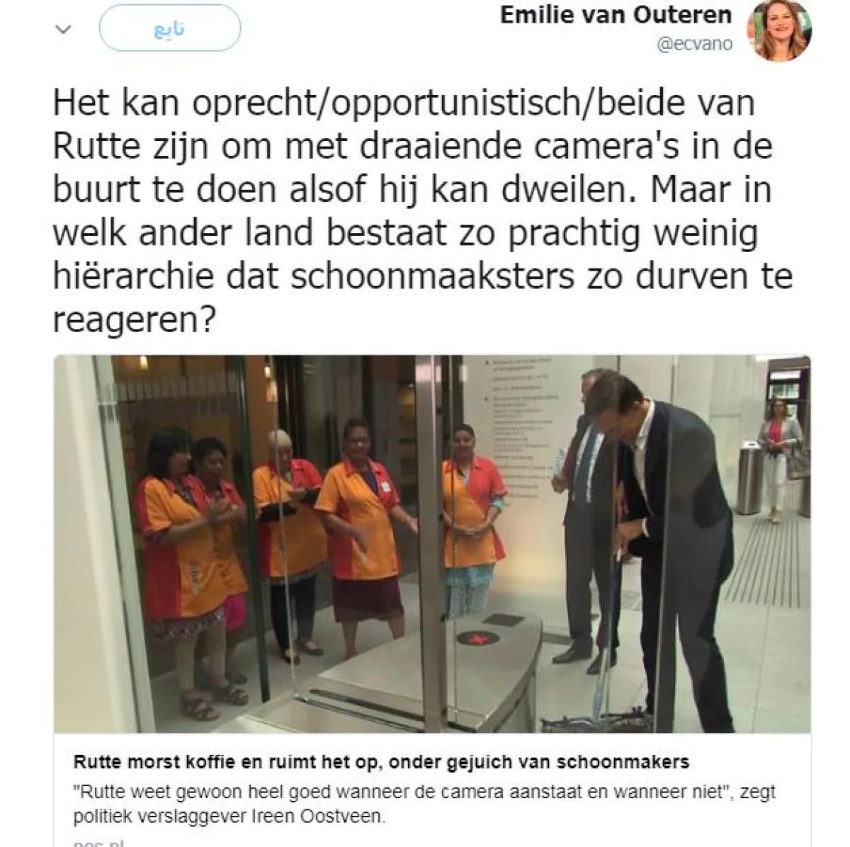 وأفادت الصحفية الهولندية "إيميلي فان أوتيرين Emilie van Outeren"، أن الأمر الذي من الممكن اعتباره "استثنائيا"، ليس ردة فعل "روته" وتنظيفه القهوة، بل الطريقة التي تعاملت بها عاملات النظافة مع الحادثة لحظتها، وفي ذلك نشرت "فان أوتيرين" عبر تغريدة على حسابها الشخصي في تويتر مفادها: "في أي بلد يوجد تسلسل هرمي مماثل، لدرجة أن عاملات النظافة يتجرأن على التفاعل مع رئيس الوزراء بهذه الطريقة؟".
