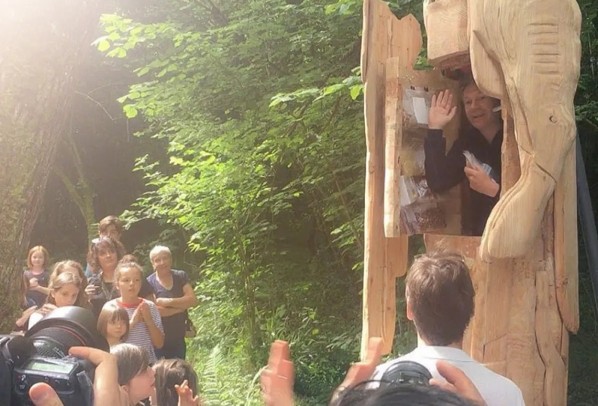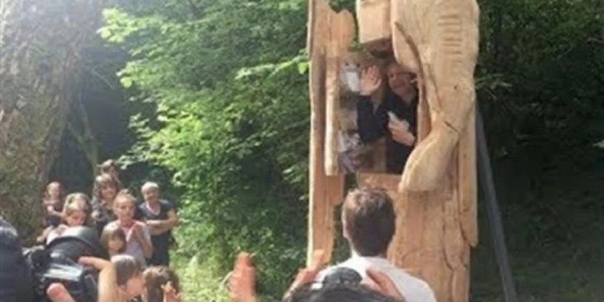 خرج الفنان الفرنسي أبراهام بونشيفال، أمس من تمثال خشبي ضخم على شكل رجل ما قبل التاريخ يرتدي جلد أسد، وذلك بعد أن أمضى سبعة أيام في داخله.
