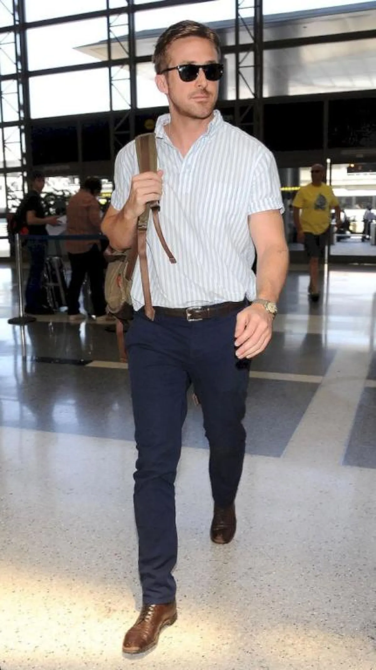 لإطلالة كلاسيكية تناسب أوقات الزيارات في العيد، يمكنك السير على خطى النجم Ryan Gosling رايان غوسلينغ باختياره القميص الكلاسيكي المخطط بالطول باللون الفاتح، مع البنطلون القماش، وحزام الخصر البني، والحذاء الكلاسيكي بنفس اللون لإطلالة متكاملة على أحدث خطوط الموضة.
