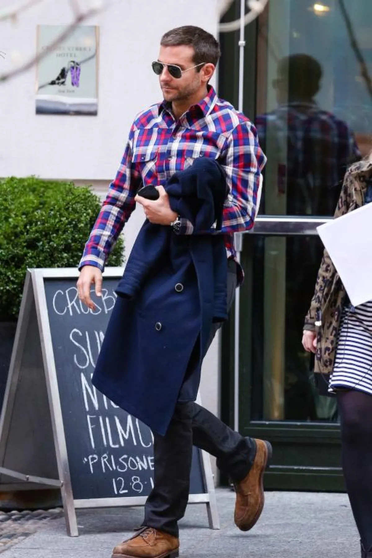 القميص الكاروهات من القطع التي لا غنى عنها في خزانة ملابسك، يمكنك الاعتماد عليه على طريقة النجم العالمي Bradly Cooper برادلي كوبر، مع البنطلون الكحلي، والحذاء البني الفاتح.