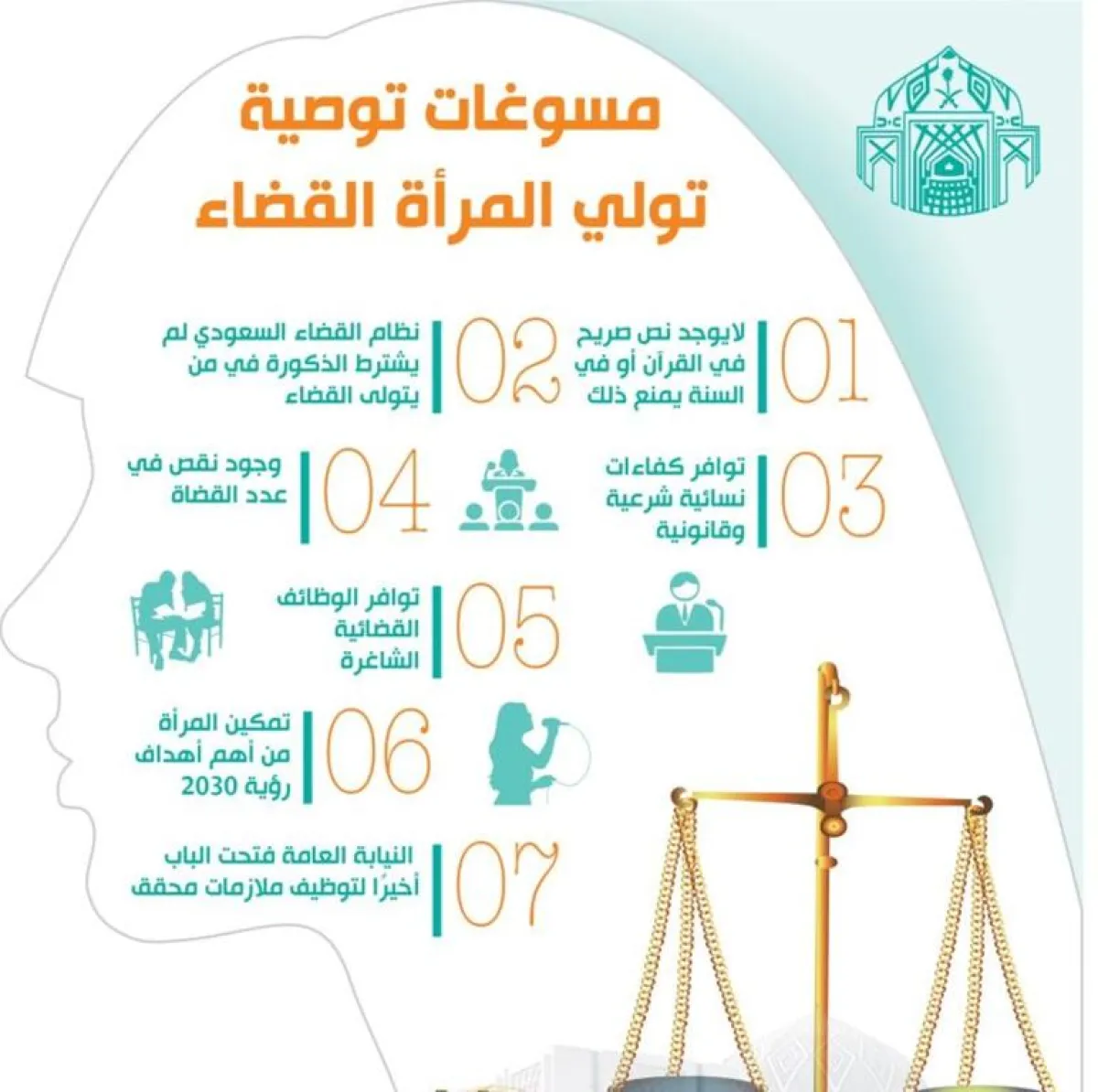 وذكر مقدمو التوصية، وهم الدكتورة لطيفة الشعلان، والدكتور فيصل آل فاضل، وعطا السبيتي، أن الفقهاء قديمًا ناقشوا تولي المرأة للقضاء، مشيرين، إلى أنه لا يوجد في الشريعة نص قطعي يحرم المرأة من ممارسة القضاء، وأن الشريعة قررت مبدأ الولاية المتبادلة بين الرجل والمرأة في سائر شؤون الحياة، بحسب صحف محلية