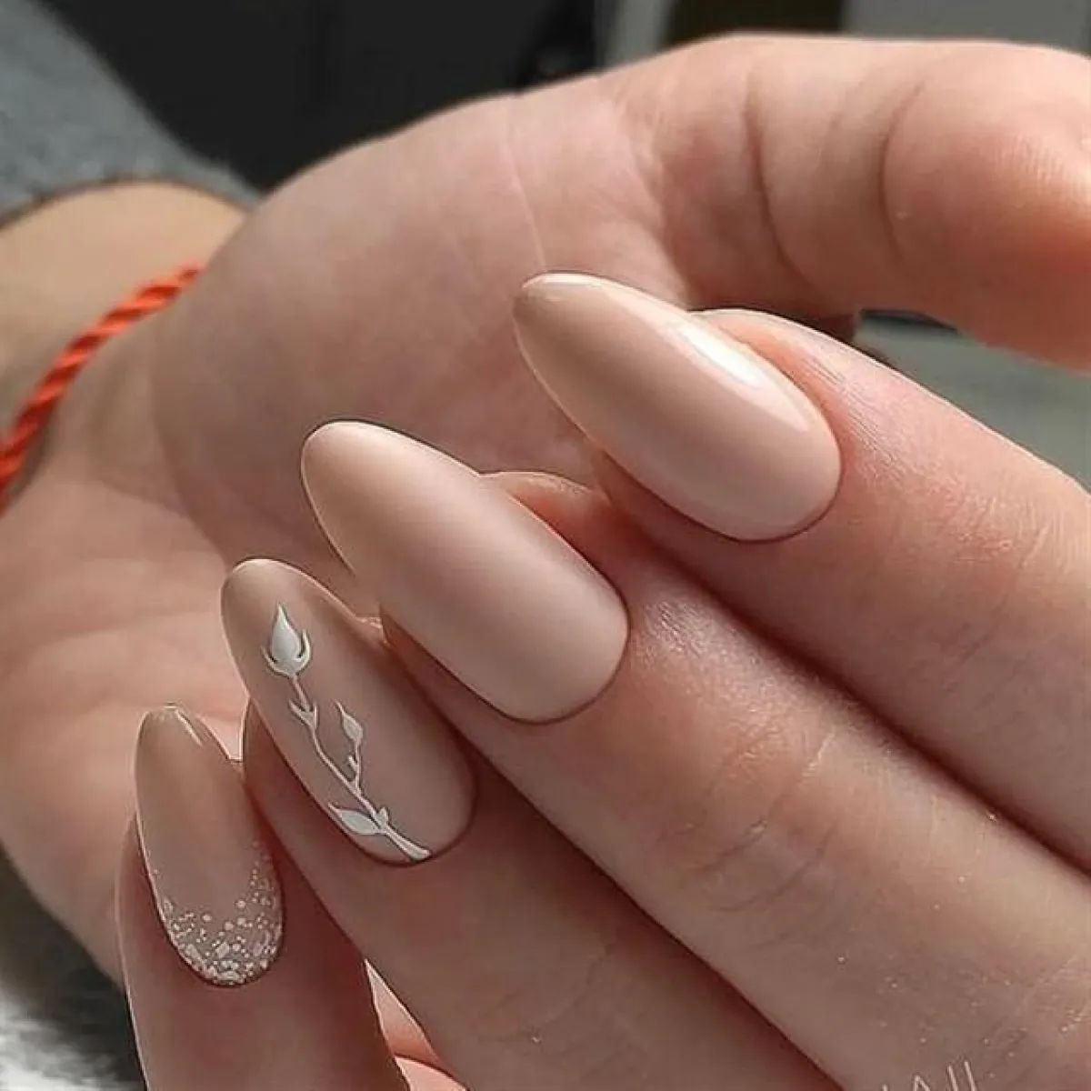 - المناكير النيود مع الزخرفات الناعمة: المناكير النيود سيمنح أظافرك طلة راقية وأنيقة، فهو لون هادئ وجذاب، ويتماشى مع مختلف ألوان الملابس التي سترتدينها. ولكن، لمزيد من الجمال والتألق، قومي في البداية بطلي أظافرك كافة بطبقتين من المناكير النيود، من ثم اعمدي الى رش بعض الحبيبات الزهرية على قاعدة الظفر الصغير، وارسمي وردة ناعمة بـ اللون الأبيض على الظفر ما قبل الأخير من كل يد.