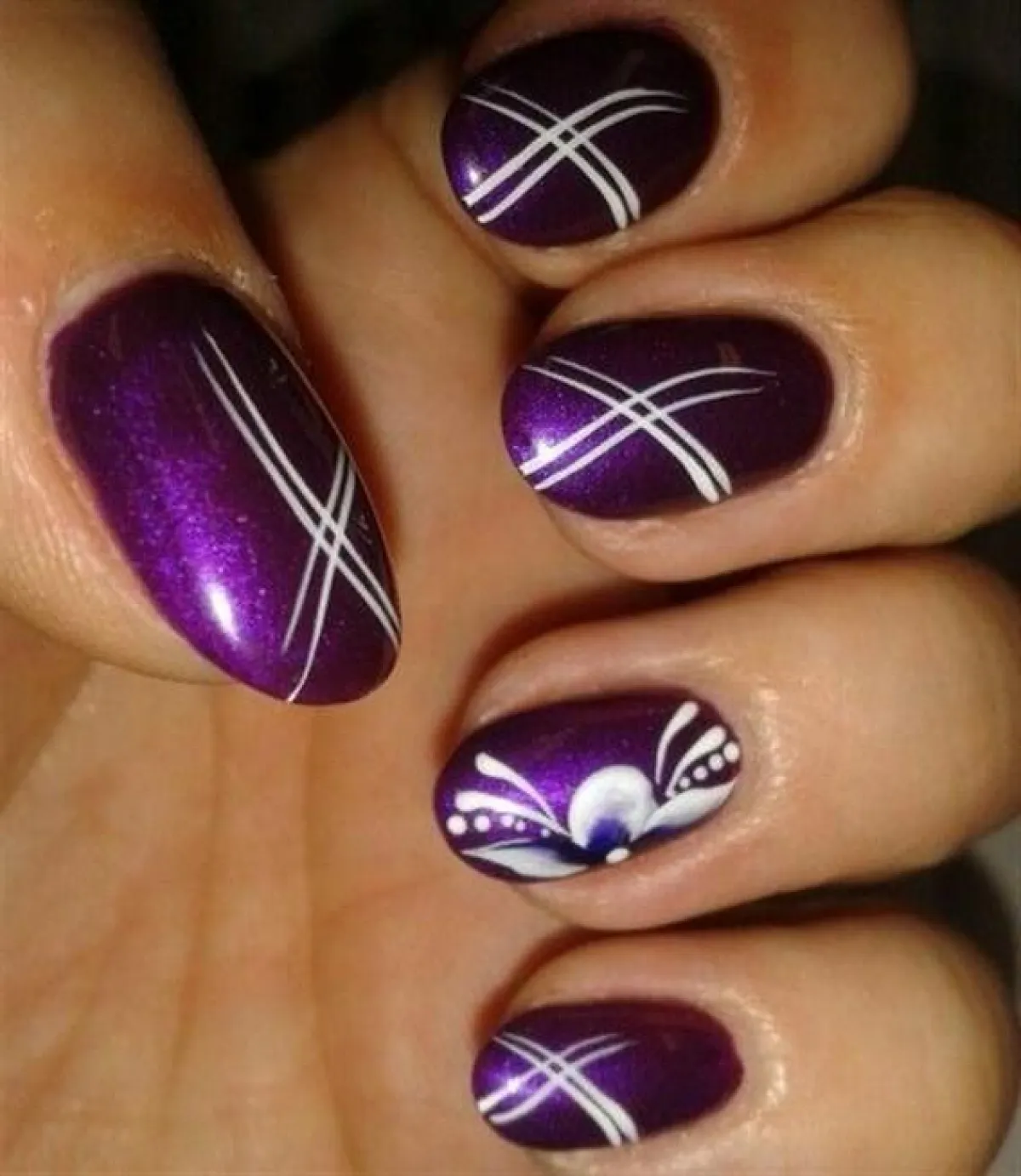 - المناكير البنفسجي الداكن مع الرسومات البيضاء: هذا المناكير ملائم لمختلف المناسبات، وهو أيضاً سيضيء أظافرك بطريقة أنيقة. لكن، لأظافر أكثر جمالاً وتميزاً، أطلي أظافرك كلها بطبقتين من المناكير البنفسجي، من ثم زينيها ببعض الرسومات الناعمة بـ اللون الأبيض.