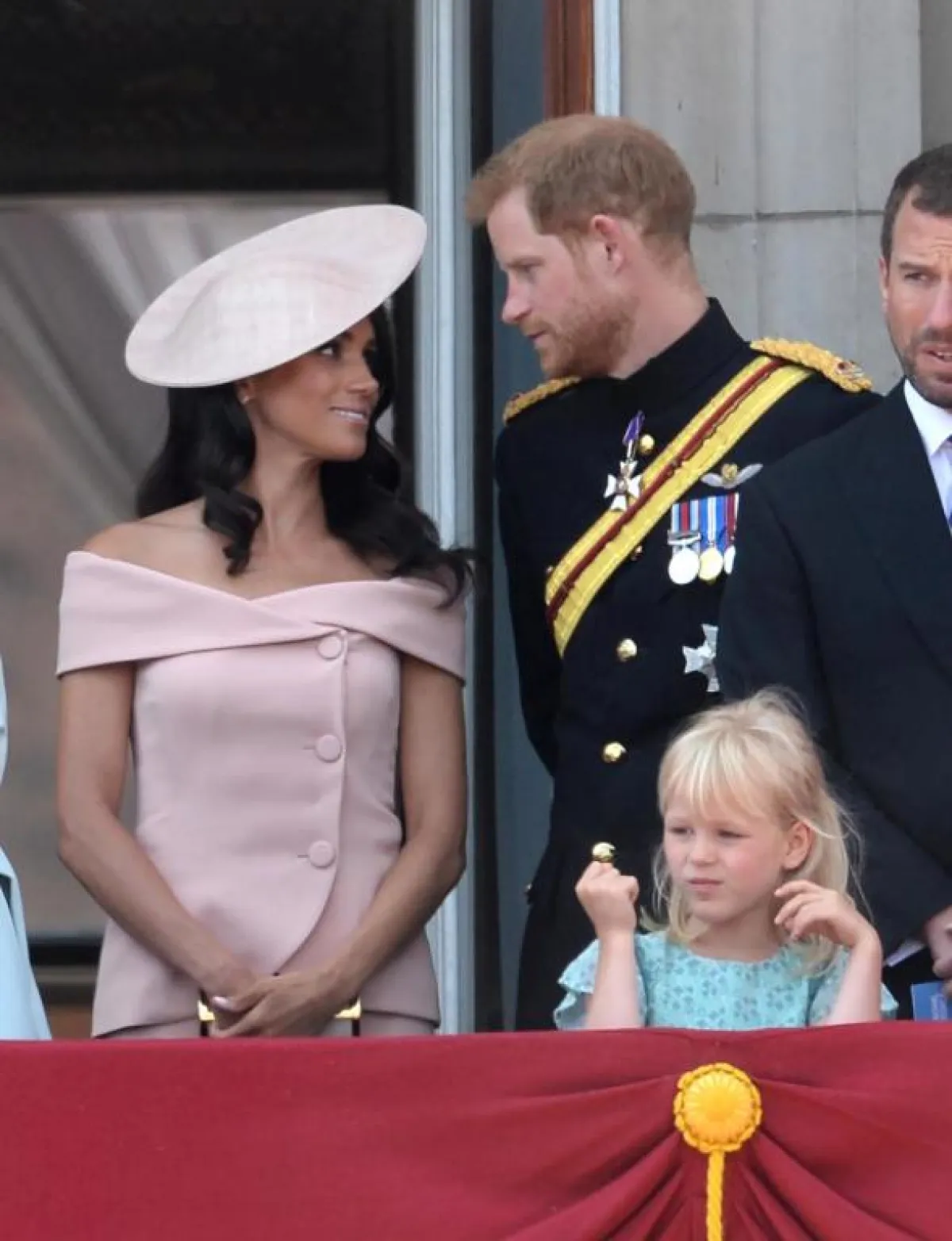 و كانت ميغان قد حضرت إلى الحفل في عربة تجرّها الخيول مع الأمير، وفي موكب من الخيالة، حيث انضمت إلى العائلة الملكية في شرفة قصر باكنغهام للمرة الأولى، بعد شهر العسل مباشرة، وتبادل الزوجان الجديدان النكات ومظاهر المحبة في الشرفة المميزة، بحسب صحيفة "ذا صن".