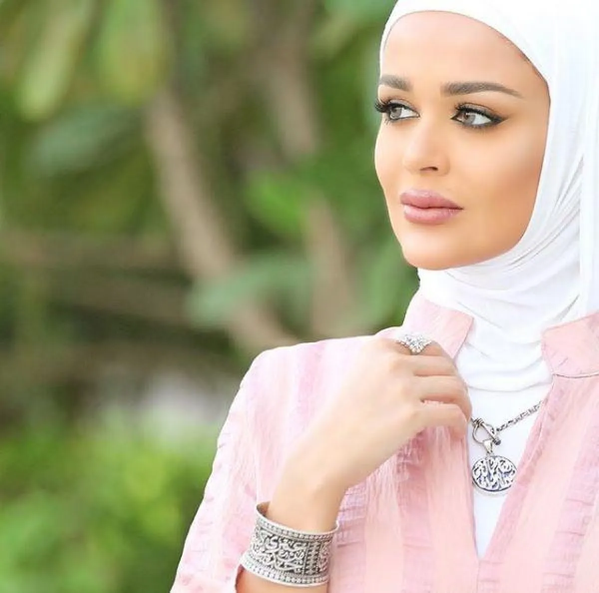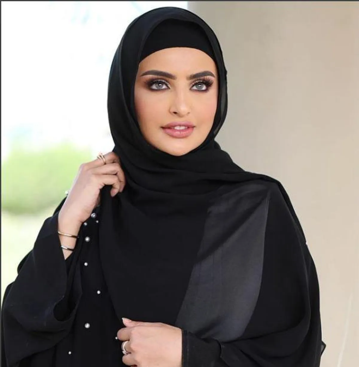 أعجبنا اختيار مدونة الموضة وخبيرة المكياج سندس القطان للطرحة الشيفون، مع البطانة من ذات اللون، لتربط الطرحة بشكل انسيابي فوضوي جذاب، يناسب وجهها الدائري، و يتماشى مع عباية من ذات اللون، حتى لا تبدو الإطلالة مبهرجة.