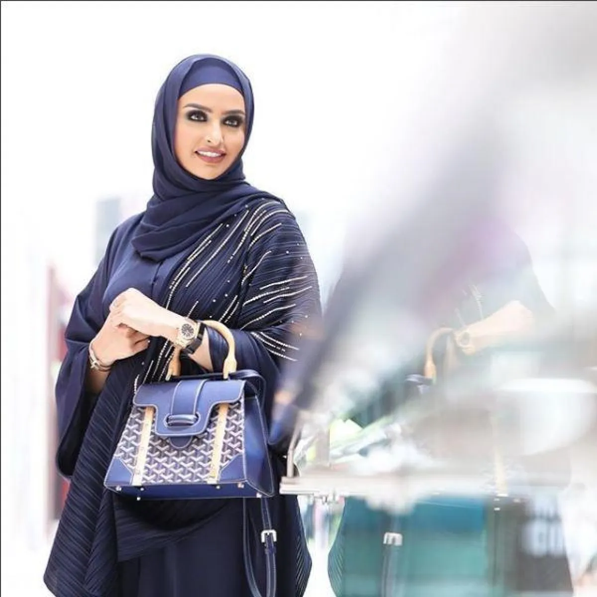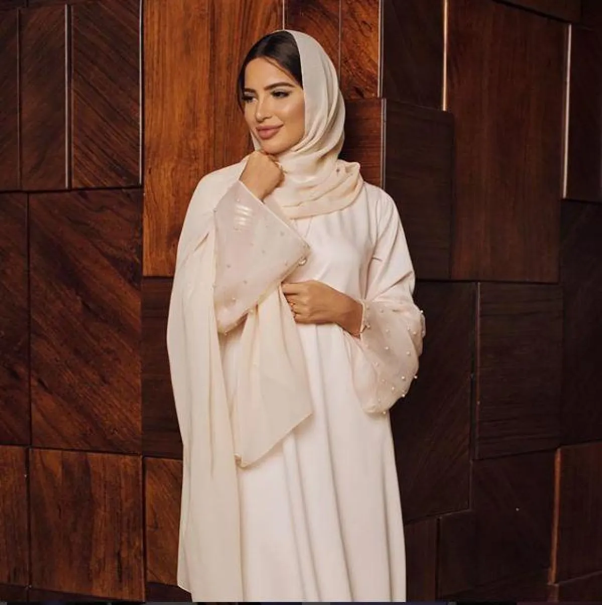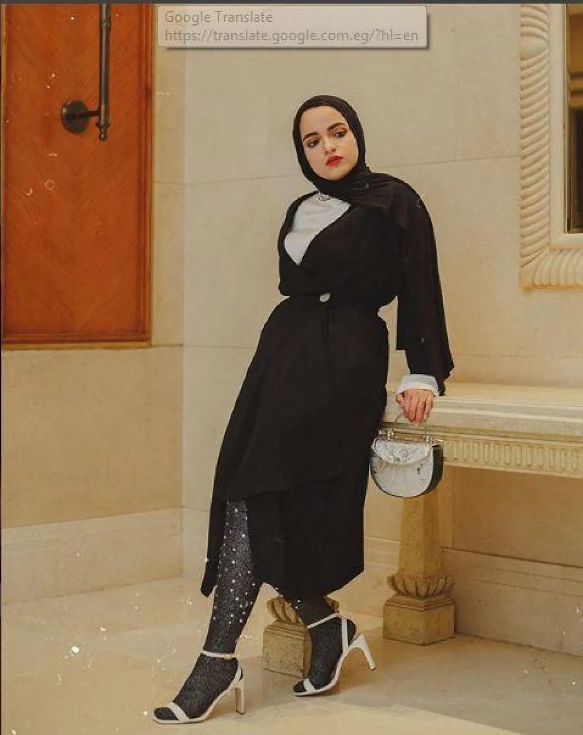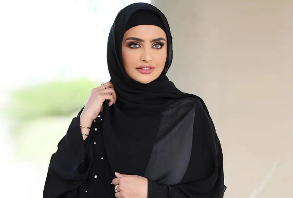 اختارت الفاشنيستا الكويتية دلال الدوب لفة الطرحة الكويتية المعروفة، التي تعتمد على ثنيها من الجانبين، والمطرزة بالخيوط اللامعة الكريستالية.