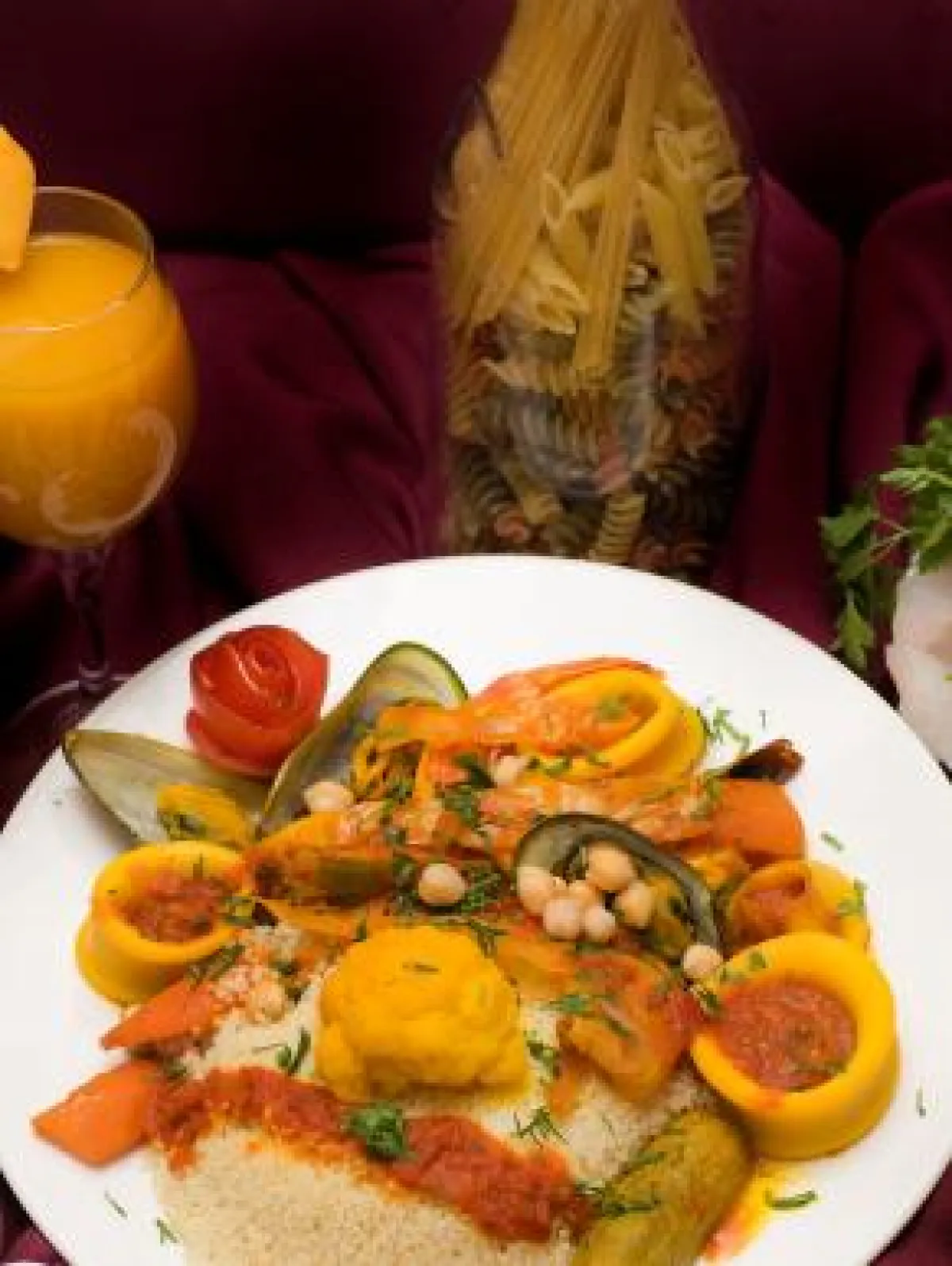 5-للتقديم: يتمّ وضع الكسكس في أسفل طبق التقديم، تعلوه ثمار البحر. وتقدّم صلصة الخضر إلى جانبه.