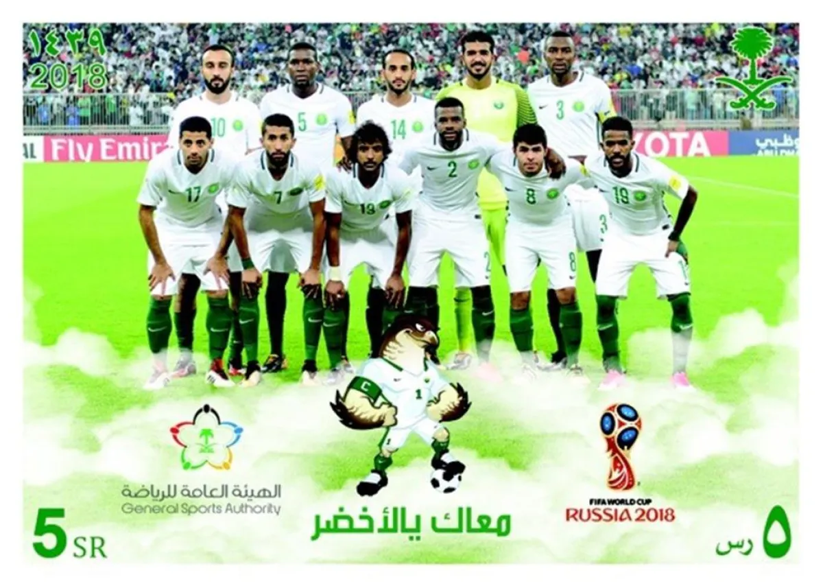 وثقت مؤسسة البريد السعودي تأهل منتخب السعودية الوطني لكرة القدم إلى نهائيات كأس العالم 2018 ومشاركته في منافساتها التي تبدأ بعد أيام في روسيا، بثلاثة طوابع تذكارية.
