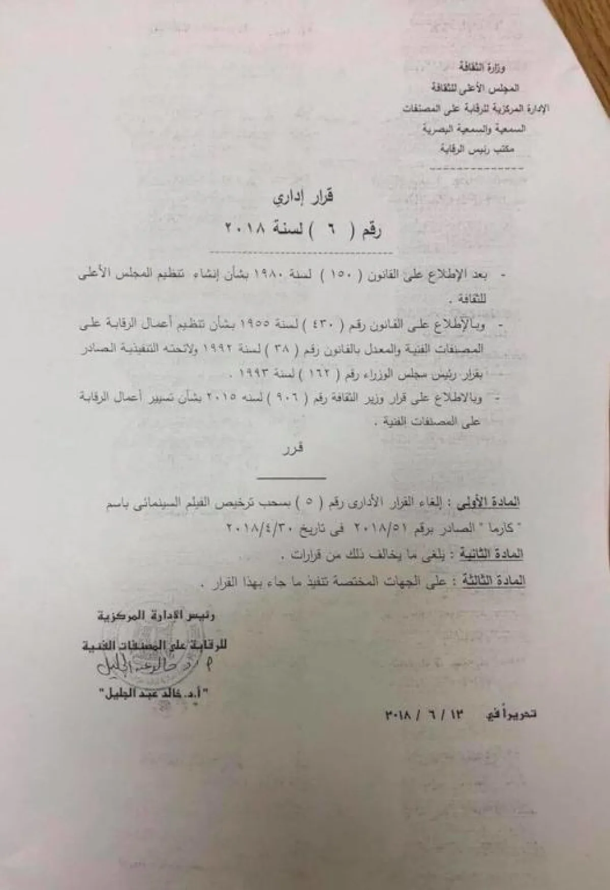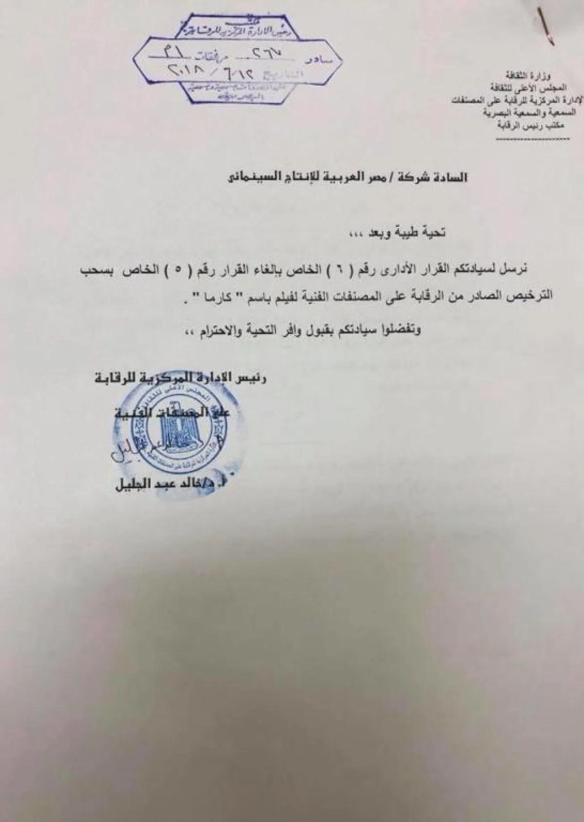 بعد مفاوضات امتدت12 ساعة كاملة، تراجعت الرقابة العامّة على المصنّفات الفنية في مصر عن قرارها بسحب ترخيص عرض فيلم "كارما" للمخرج خالد يوسف، وقامت بمنحه تصريحاً جديداً، وأكّد خالد أنّ المفاوضات لم تنتهِ إلى حذف أي مشاهد من الفيلم، مؤكداً أنّه سيعرض كاملاً بدءاً من يوم الخميس المقبل، كما تمّ عرض النسخة الكاملة في العرض الخاص مساء أمس الثلاثاء.