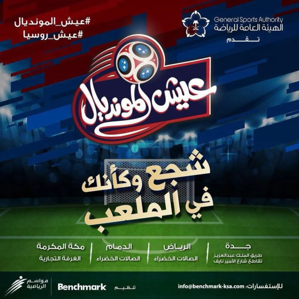 «عيش المونديال» فعالية رياضية جماهيرية لنقل أحداث كأس العالم، بتنظيم من «بنش مارك» و«مواسم الرياضية»، ويتوقع حضور فعاليات جدة والرياض 3000 زائر، و1500 زائر في الدمام ومكة المكرمة، ومن المتوقع أيضًا زيادة حصص الزائرين للفعاليات في الأيام الأولى لعيد الفطر المبارك.