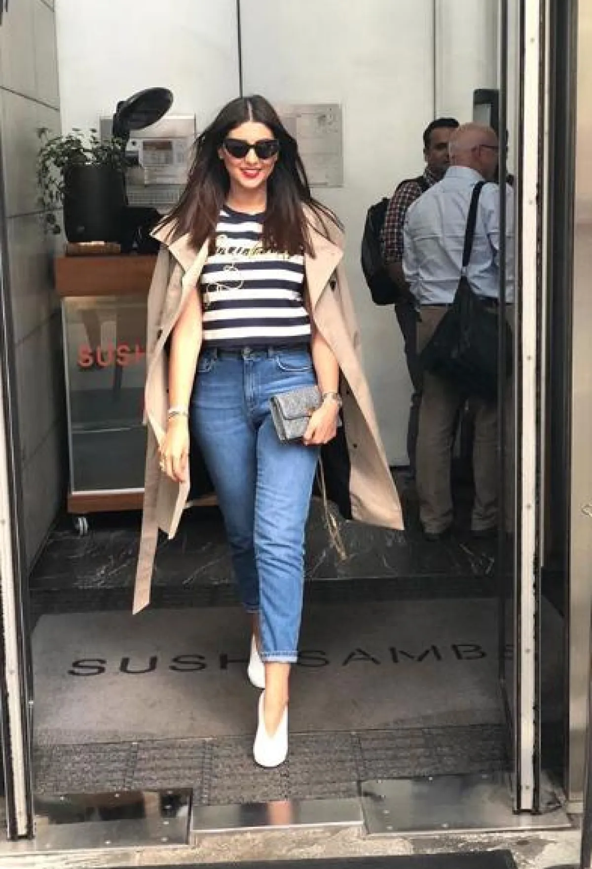 اطلالة شبابية أنيقة اعتمدتها مريم سعيد نسقت فيها قميص معرق مع بنطلون جينز وحقيبة يد من الجلد من “ديور” Dior، ونظارات شمسية عصرية.
