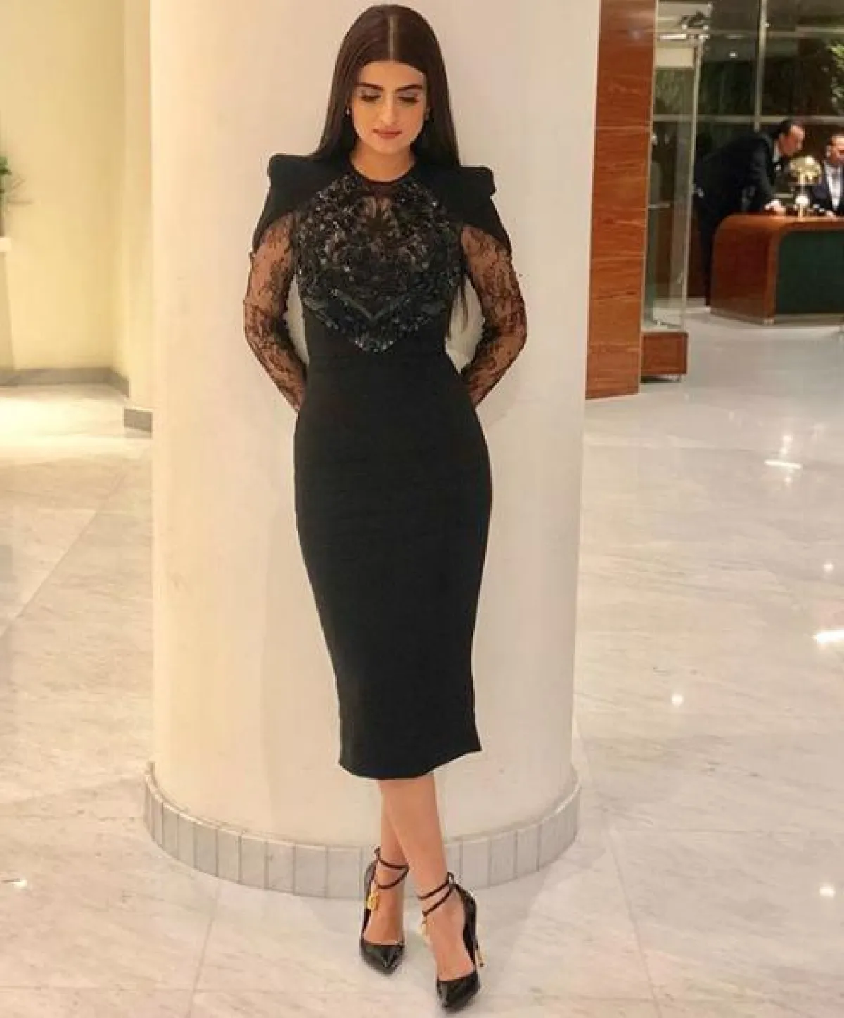 أما علا الفارس فقد اختارت الأسود على فستان ميدي من الدانتيل من “زهير مراد” Zuhair Murad نسقته مع حذاء كعب عالي من “توم فورد” Tom Ford.