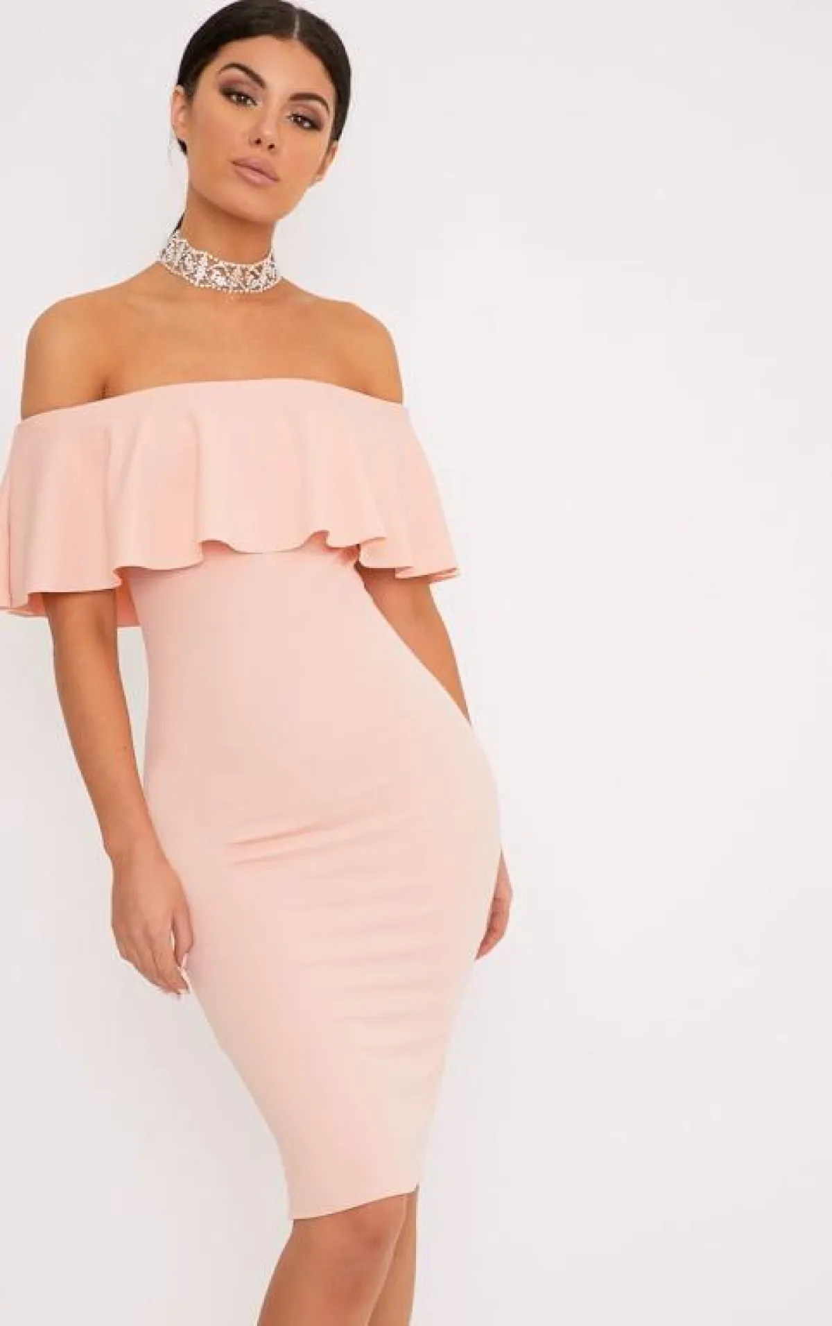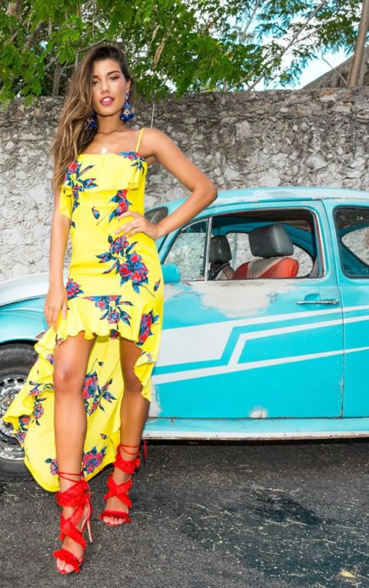 ويمكنكِ معه ارتداء حذاء ذي كعب عالٍ من لون الفستان نفسه، أو باللون الأحمر الناري مع الشراشيب.