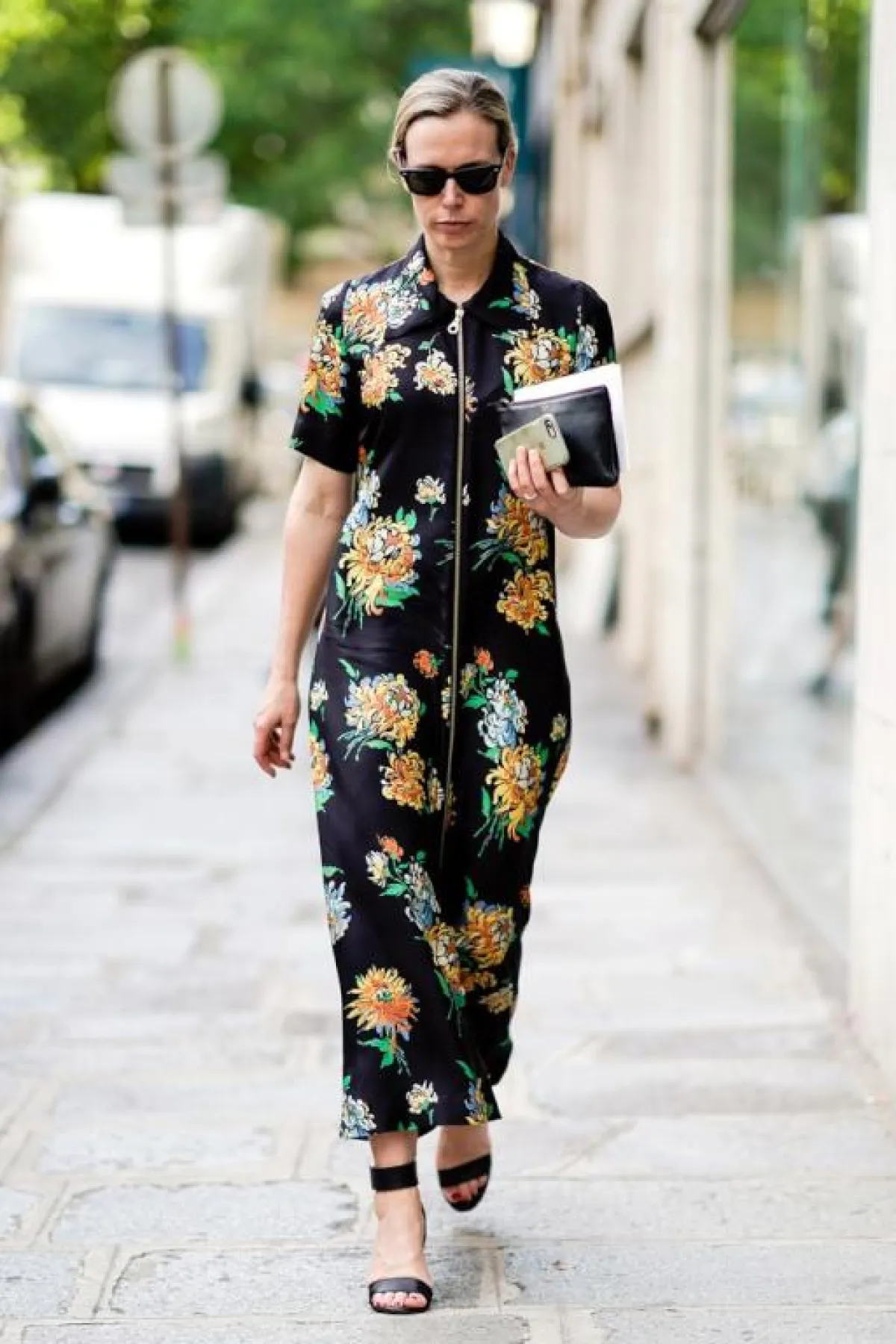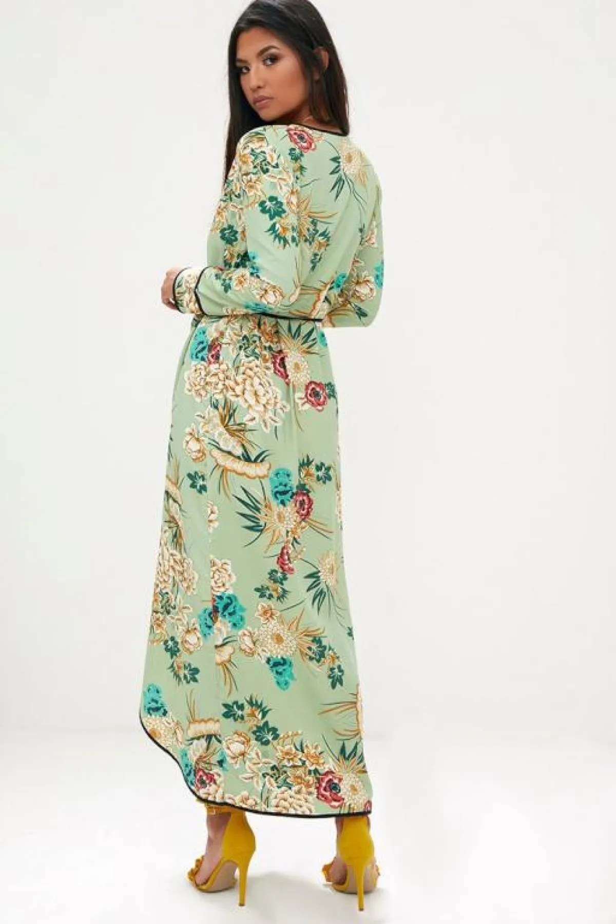 أعجبنا الفستان الماكسي الطويل، مع رسومات الورود باللون الفيروزي، بتصيم الروب، وكأنه قطعة آتية من أعماق البحار، وتنسيق الحذاء ذي الكعب العالي، باللون الليموني، والذي يناسب أكثر وقت السهرات الصيفية الرومانسية مع زوجكِ.