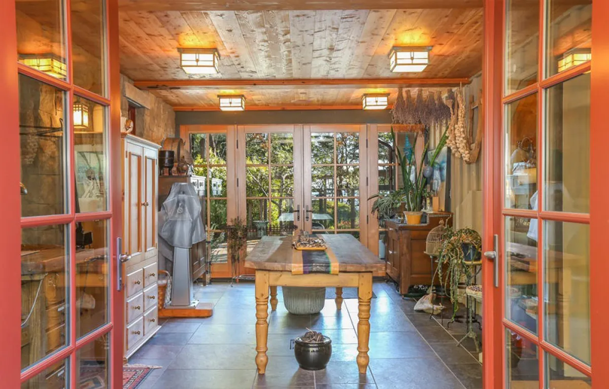 بالقرب من البيت الرئيس، ثمة قاعة للشاي تحت مظلَّة من الأشجار تطلُّ على المياه، وعلى مسافة أبعد قليلًا هناك مبنى كبير يشبه الحظيرة، كما "استوديو" للنجارة في الطبقة العلوية وصالة ألعاب رياضية و"استديو" لليوجا في الطبقة السفليَّة.