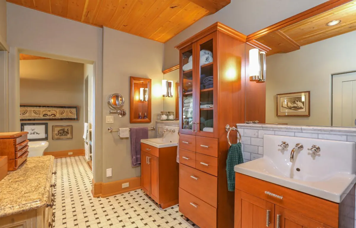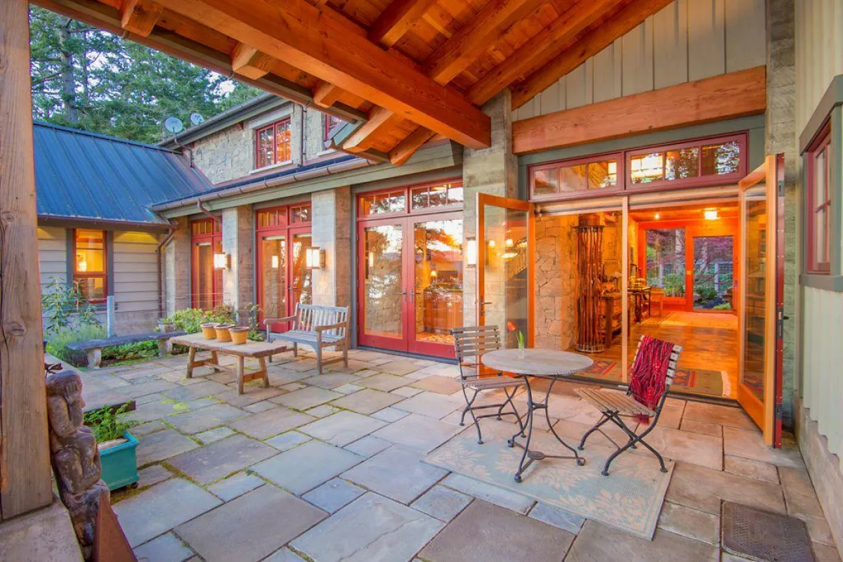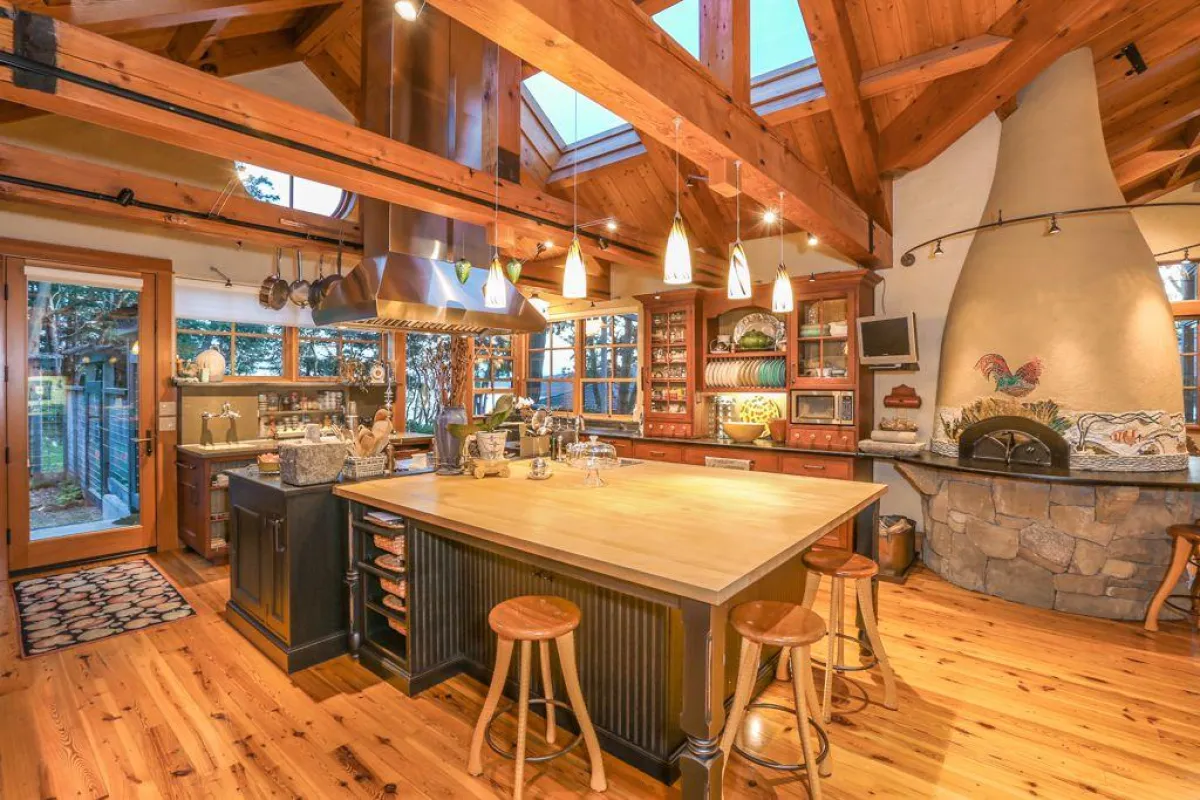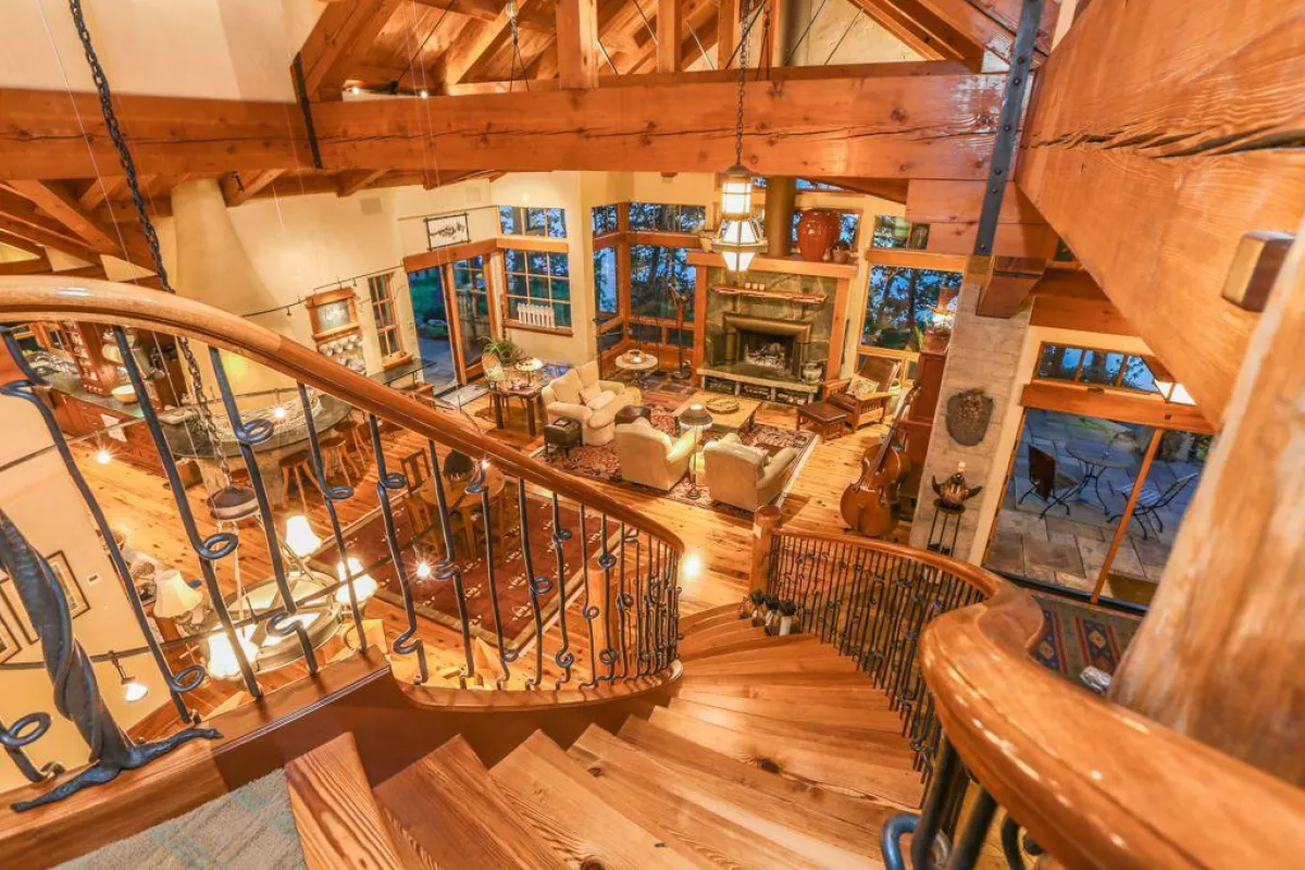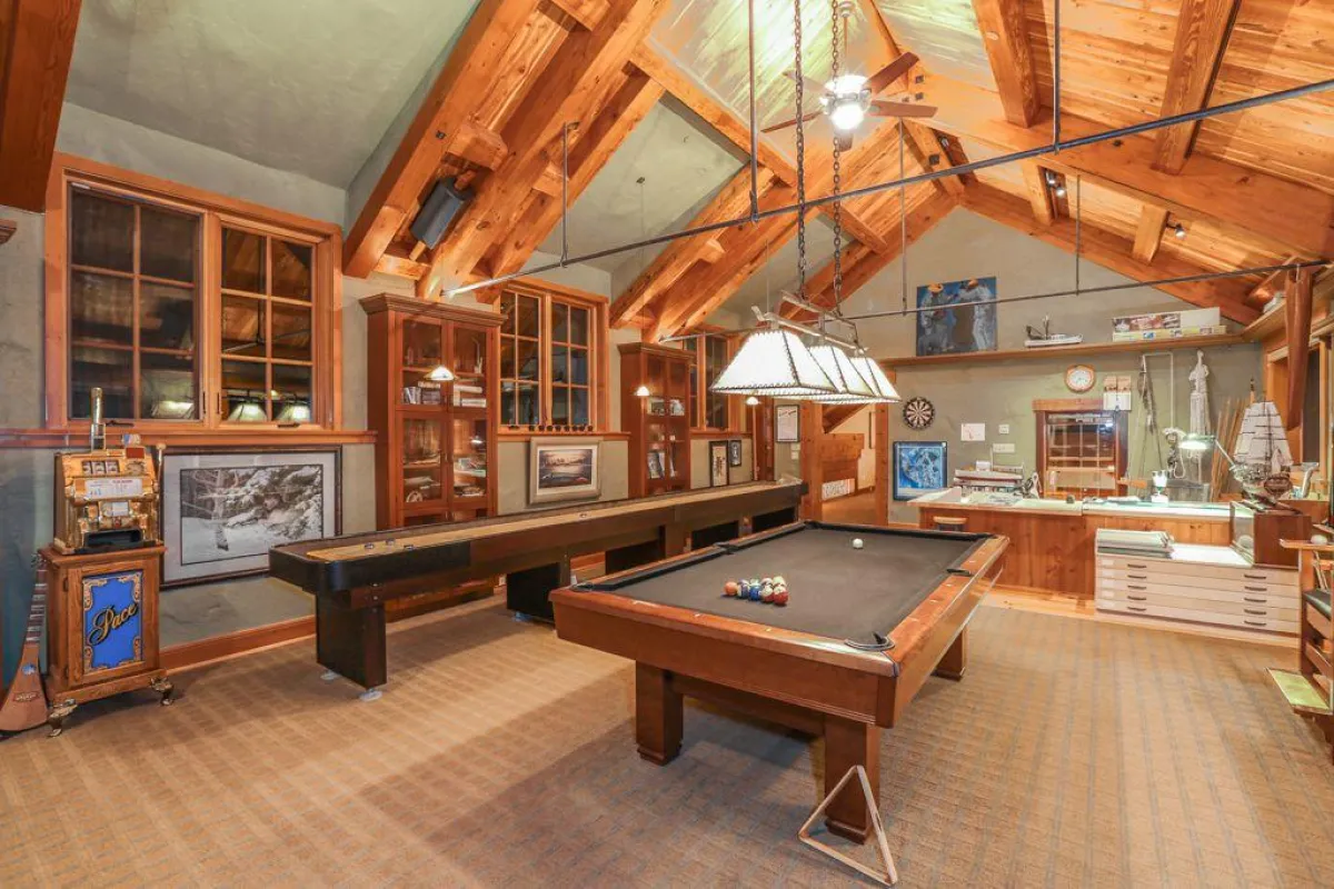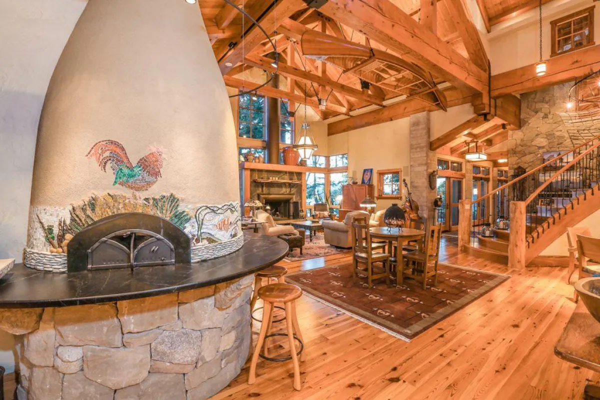 في الداخل، تتكوَّن منطقة المعيشة الرئيسة من مساحة عالية السقف تشمل صالة مع مدفأة حجرية وركنًا لتناول الطعام مع كراس ذات مساند عالية، ومطبخًا تتوسُّطه جزيرة مركزية كبيرة وفرن بيتزا مدمج. تضمُّ الطبقة الأولى أيضًا مكتبة تمتد رفوفها من الأرض إلى السقف. وتقع الغرفة العائلية الكبيرة في الطبقة العلوية، وتحتوي على طاولة ومسبح وجهاز تلفزيون بشاشة كبيرة.