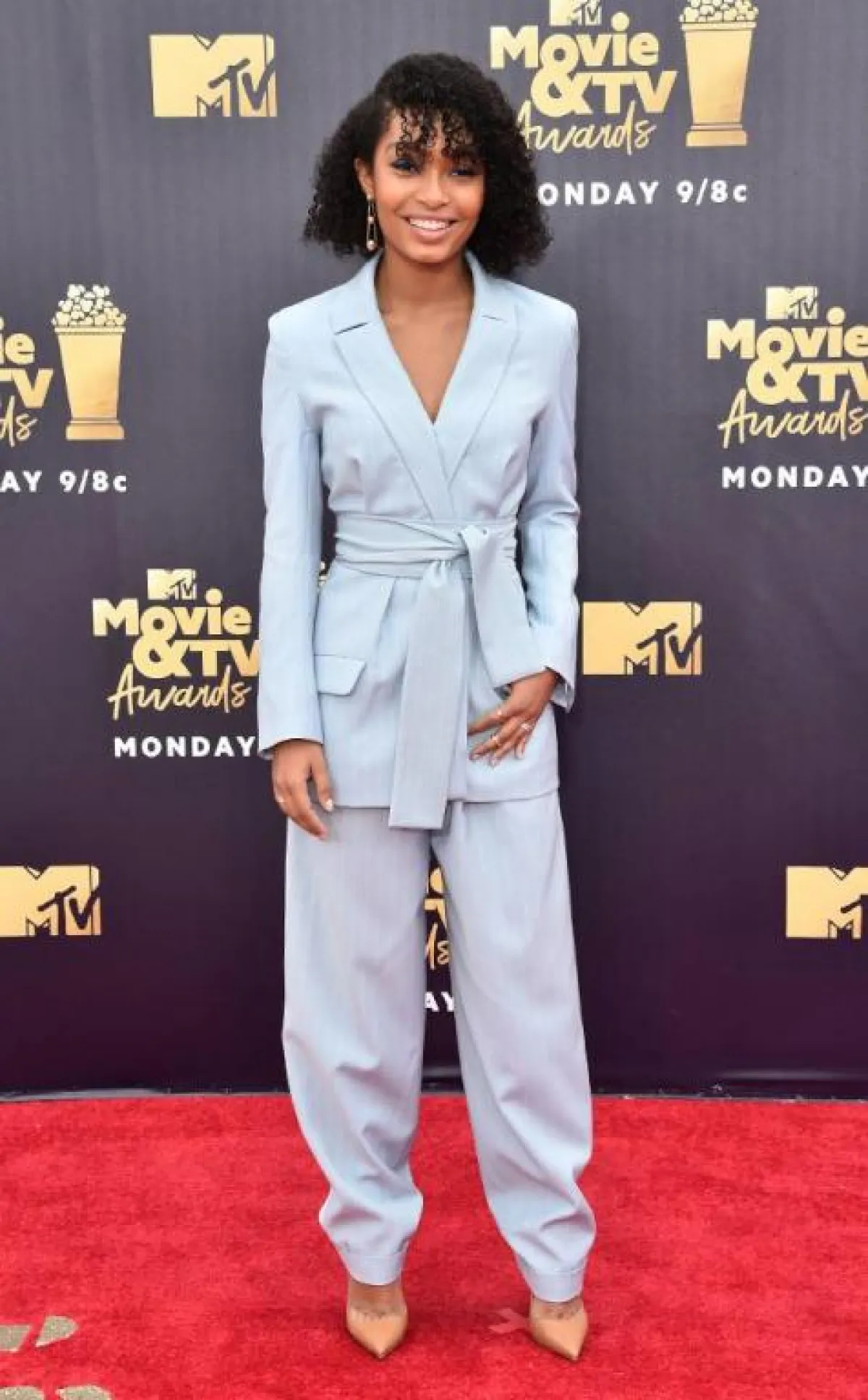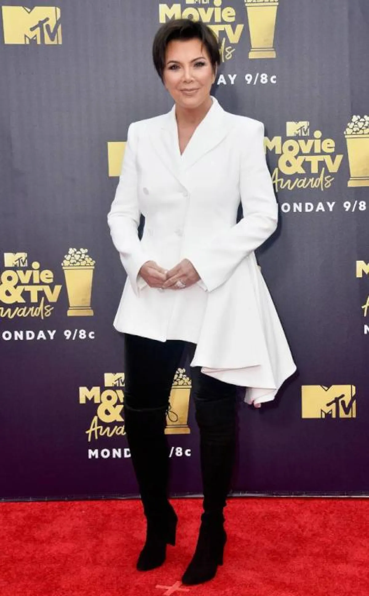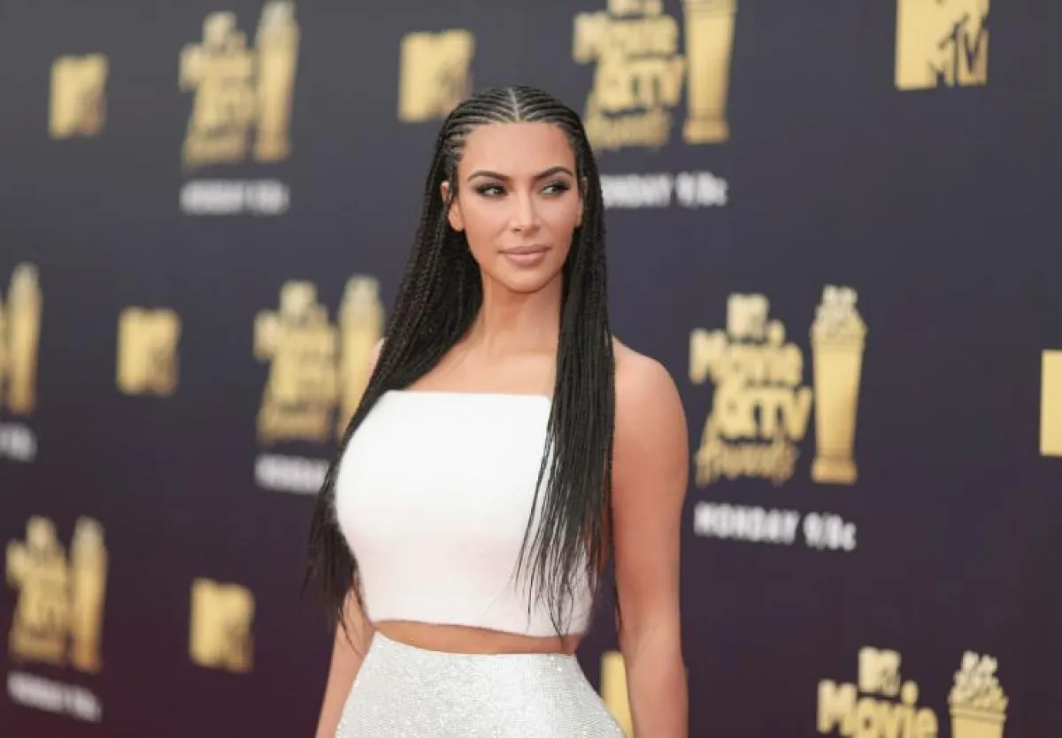 اختارت “كيم كارداشيان” Kim Kardashian لحفل الـ MTV اطلالة مميزة من دار “فريساتشي” Versace كانت عبارة عن تنورة ماكسي براقة باللون الفضي نسقتها مع توب قصيرة باللون الأبيض من الموهير، وقد أكملت اللوك بصندل أسود له ربطات على الساق، واعتمدت تسريحة شعر مبتكرة مستوحاة من شعر النساء الأفريقيات.