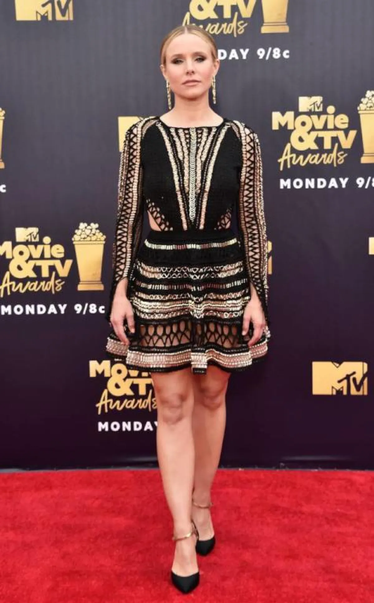 اختارت النجمة “كريستيان بيل” Kristian Bell فستان قصير باللونين الأسود والذهبي من “جوليان ماكدونالد” Julien Macdonald، وقد نسقت معه حذاء كعب عالي أسود وأقراط ذهبية لافتة.