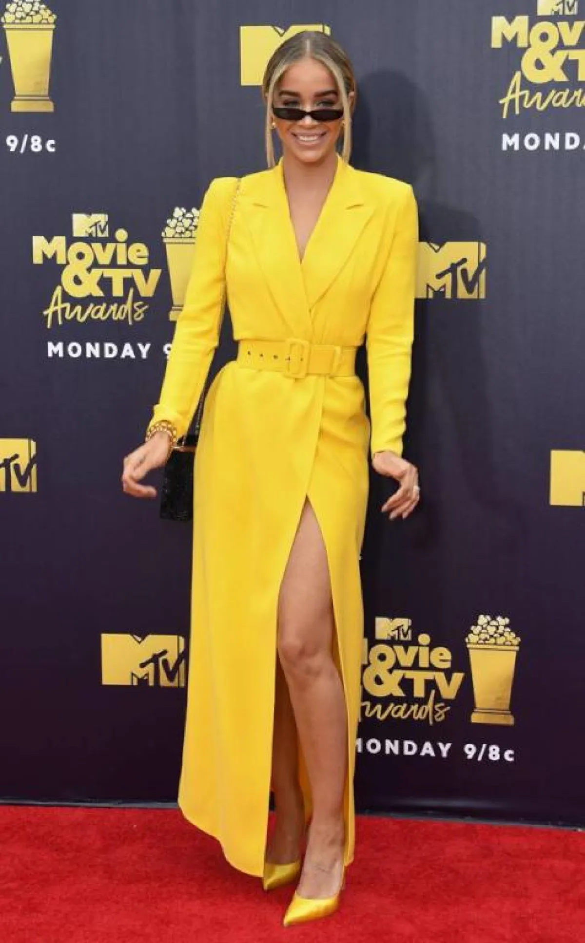 اختارت “جاسمين ساندرس” Jasmine Sanders أو الملقبة بـ Golden Barbie اطلالة جريئة ولافتة باللون الأصفر، عبارة عن فستان ماكسي مع شق طويل على الساق، نسقته مع حذاء من نفس اللون ونظارات شمسية بتصميم عصري.