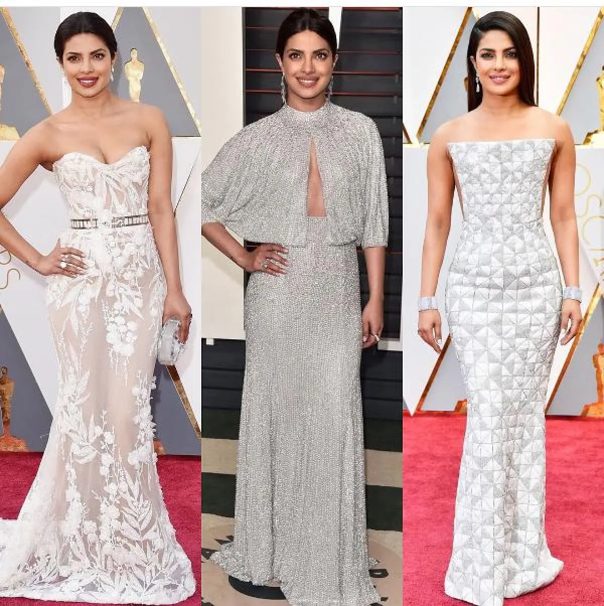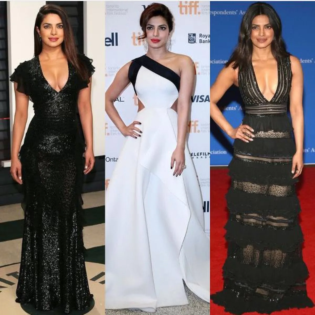 تختار بريانكا اطلالات كلاسيكية باللونين الأبيض والأسود، لإضفاء أسلوب كلاسيكي أكثر، فارتدت فستانًا باللون الأبيض بتصميم كتف واحد، كما تألقت بفستان باللون الأبيض مزيّن بتطريز من اللون نفسه.