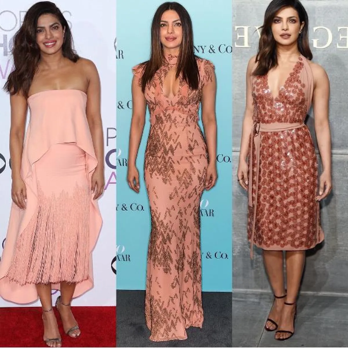 كما تختار بريانكا فستانًا من الترتر البراق باللون الزهري من دار بوتيغا فينيتا Bottega Veneta، وبدا اللوك مميّزًا عليها، وآخر باللون الزهري الناعم مكشوف الكتفين.