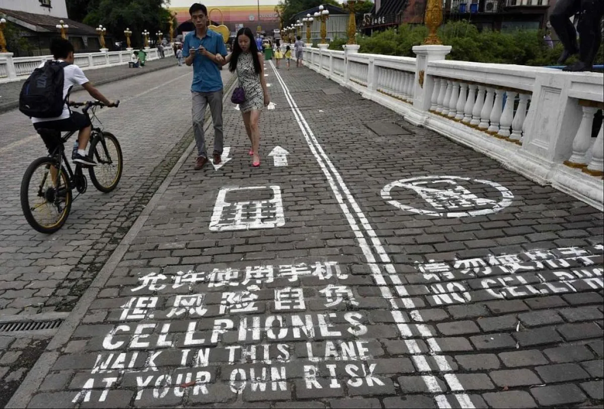 أيام العطلة الأسبوعية يشتد زحام المشاة، خاصة في المراكز التجارية، وعليه فقد تم في مدينة «شيان» شمال الصين تخصيص مساراً للمشاة الذين يستخدمون الهاتف المحمول أثناء السير. حيث افتتح أحد مراكز التسوق في المدينة على طريق «يانتا رود» المسار المخصص للمشاة مستخدمي الهاتف المحمول ويبلغ طوله 100 متر وعرضه 80 سنتيمترا ويوفر مساحة واسعة للمشاة أثناء استخدام الهاتف. وتم تمييز هذا المسار برسم صورة هاتف محمول وعليها عبارة «سلفونز» أي هواتف خليوية على أرض الطريق، في حين أن المسار الآخر الذي لا يسمح فيه لمستخدمي الهواتف المحمولة بالسير فيه، فيحمل صورة هاتف محمول وعليها علامة إكس.