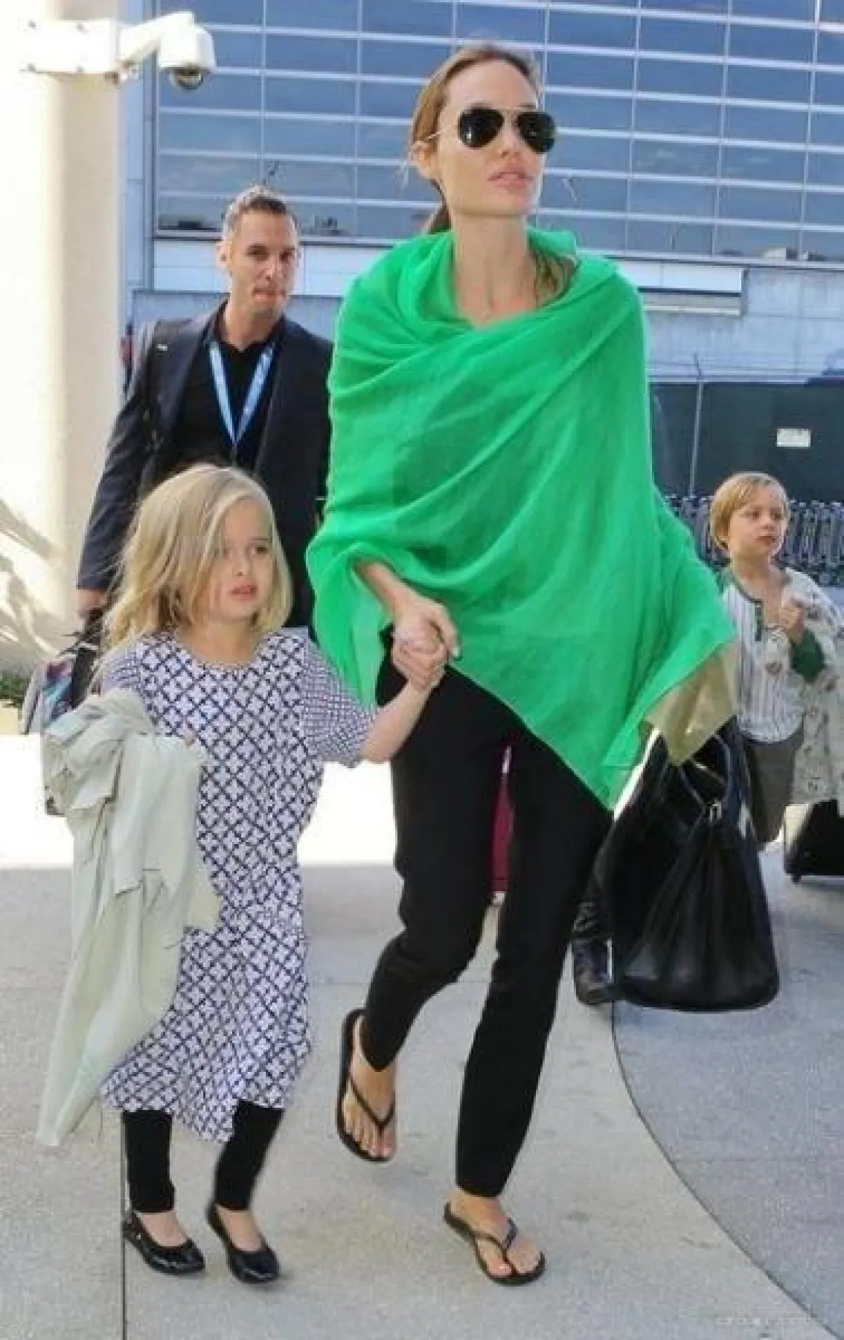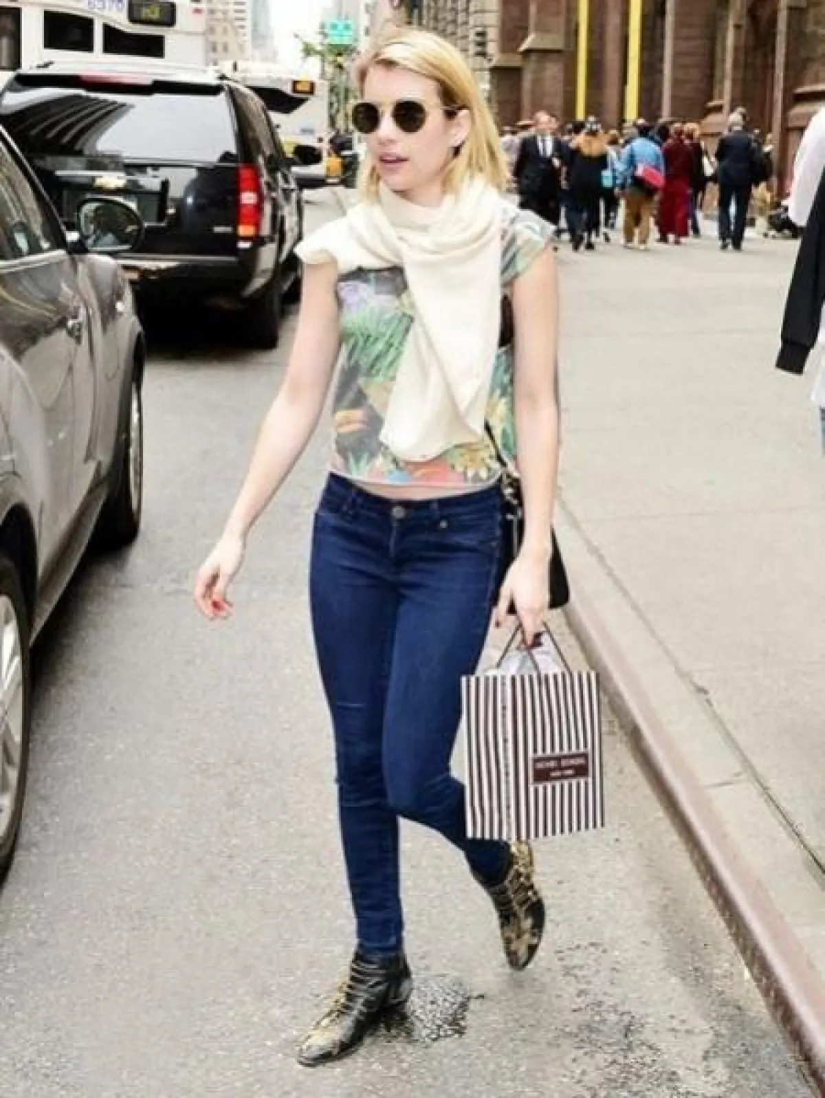 -وشاح أخضر طويل يمكن اعتماده كـ Angelina Jolie مع بنطلون جينز وحذاء رياضيّ بتصميم مميّز.