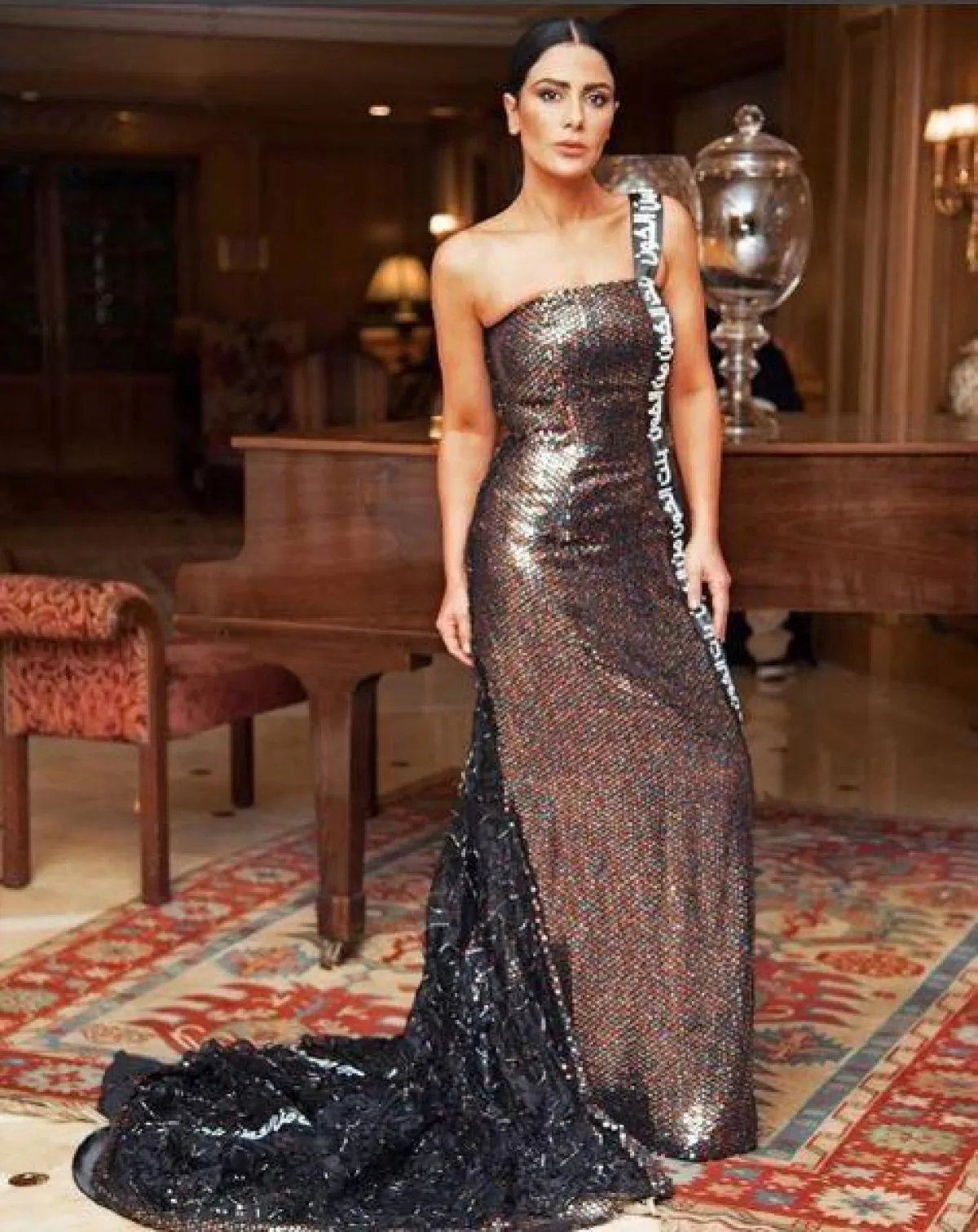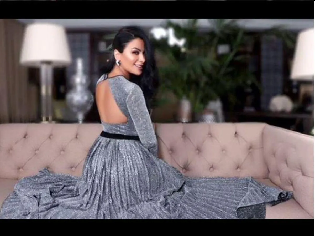 أعجبنا كذلك فستانها الفضي الميتاليك بخامة البيليسيه مع شعرها الأسود الليلي، و حزام الخصر باللون الأسود، وفتحة الظهر الجريئة، مع الأكمام الطويلة.