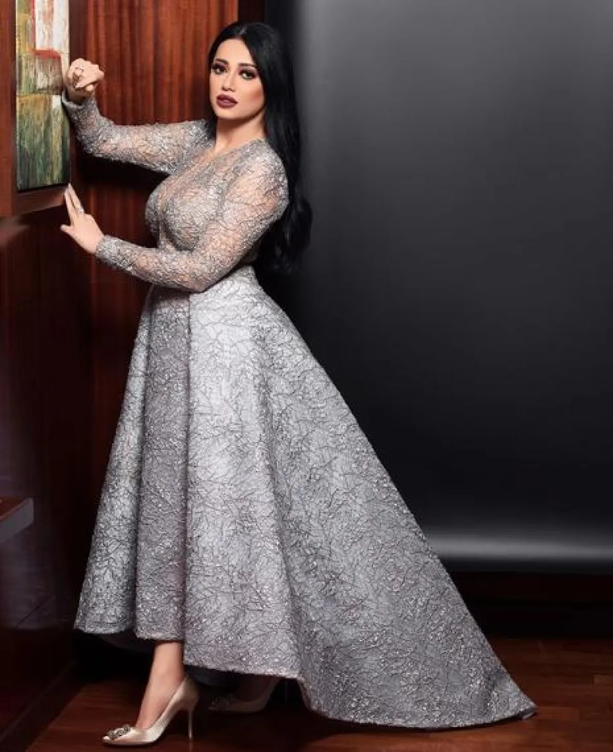 في أحدث اطلالات رحمة رياض شاهدناها في فستان باللون الفضي بقصة فاخرة مستوحاة من فساتين الأميرات، نسقته مع حذاء كعب عالي مزين ببكلة مرصعة بالكريستال من “مانولو بلانيك” Manolo Blahnik.