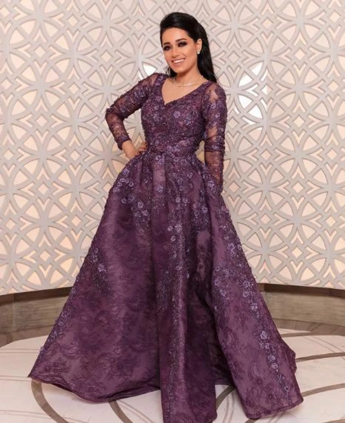 فستان باللون البنفسجي تألقت به رحمة رياض بقصة مميزة مع ياقة مفتوحة على شكل حرف V وأكمام طويلة، وقد زينت اللوك بـ مجوهرات ماسية ناعمة.