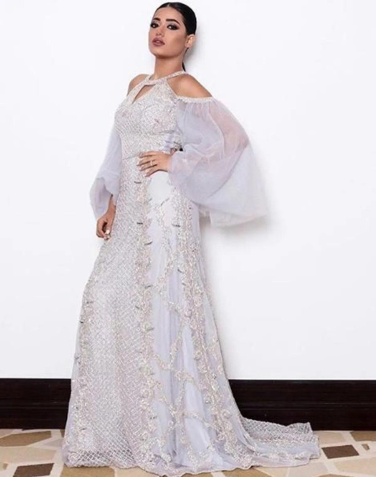 اطلالة ملكية تألقت بها رحمة رياض حيث اختارت فستان فاخر باللون الأبيض البراق، بقصة محتشمة ومميزة ونسقت معه أقراط كبيرة وبارزة.
