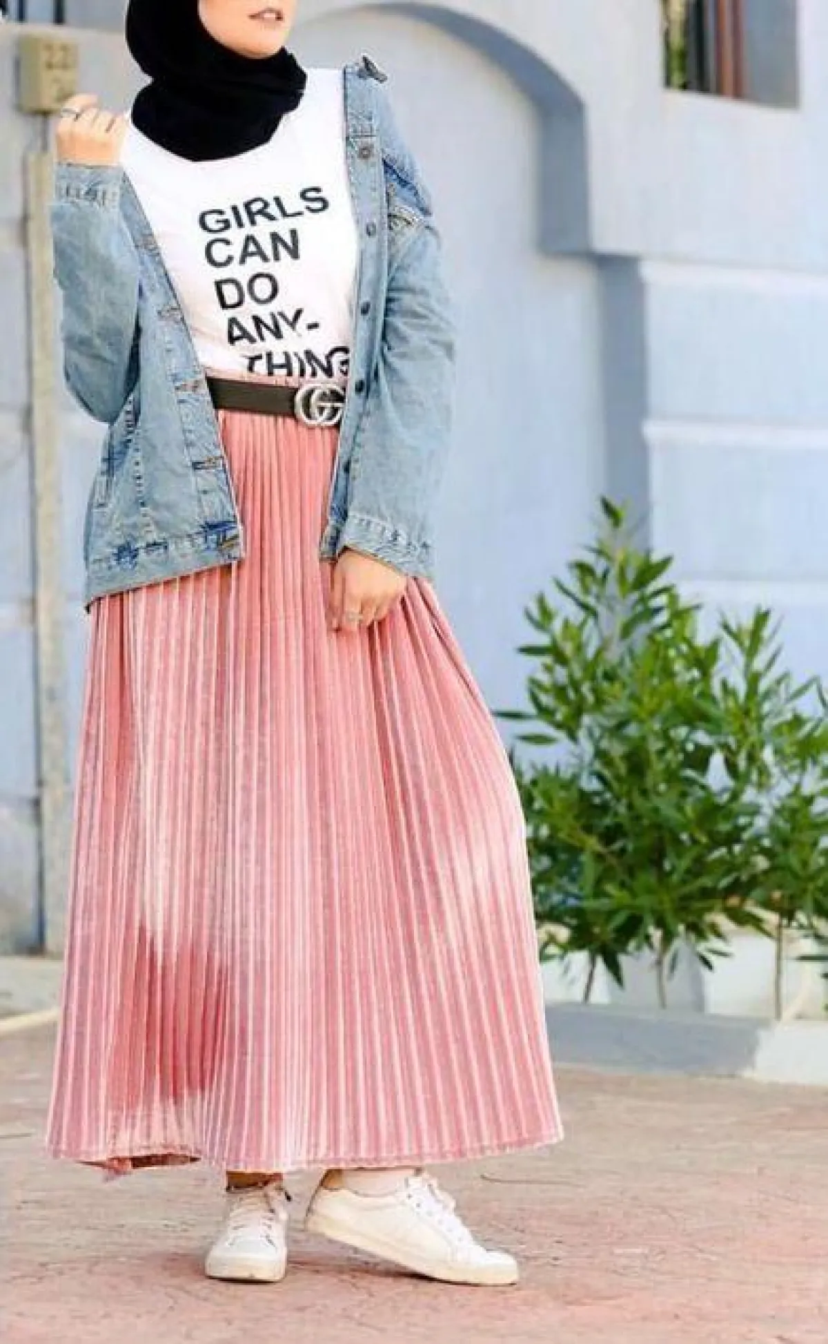 نسقي التنورة باللون الوردي مع تي شيرت T- shirt باللون الأبيض وجاكيت جينز oversize، واحرصي أن تضعي الـT- SHIRT بداخل التنورة للحصول على مظهر جذاب.