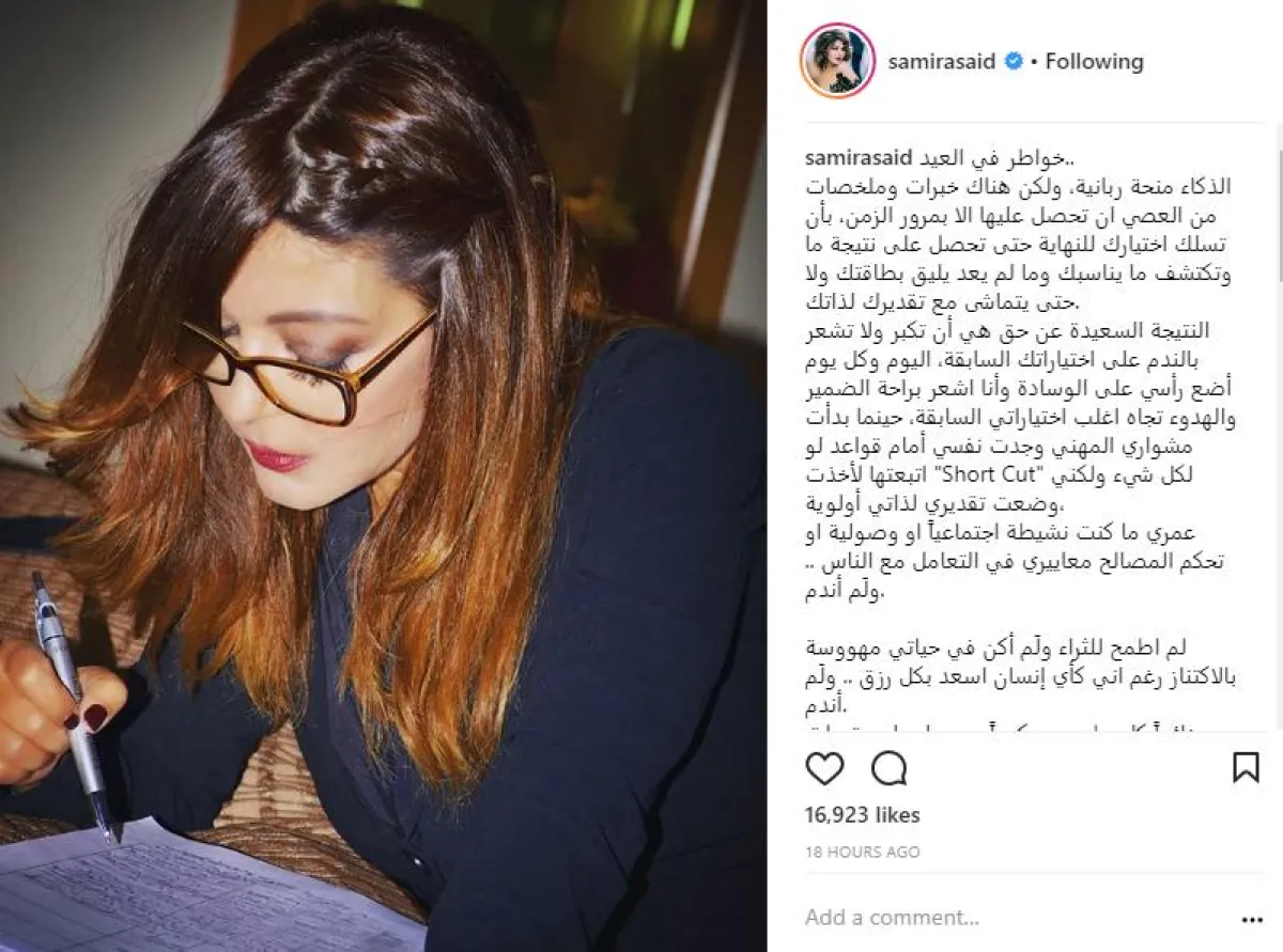 سميرة سعيد التى تقضي عطلة صيفية مع ابنها بساحل الجونة في مصر، نشرت عبر حسابها على موقع إنستقرام خواطرها حول رحلة نجاحها قائلة: خواطر في العيد.. الذكاء منحة ربانية، ولكن هناك خبرات وملخصات من العصي أن تحصل عليها إلا بمرور الزمن، بأن تسلك اختيارك للنهاية حتى تحصل على نتيجة ما وتكتشف ما يناسبك وما لم يعد يليق بطاقتك ولا حتى يتماشى مع تقديرك لذاتك..."