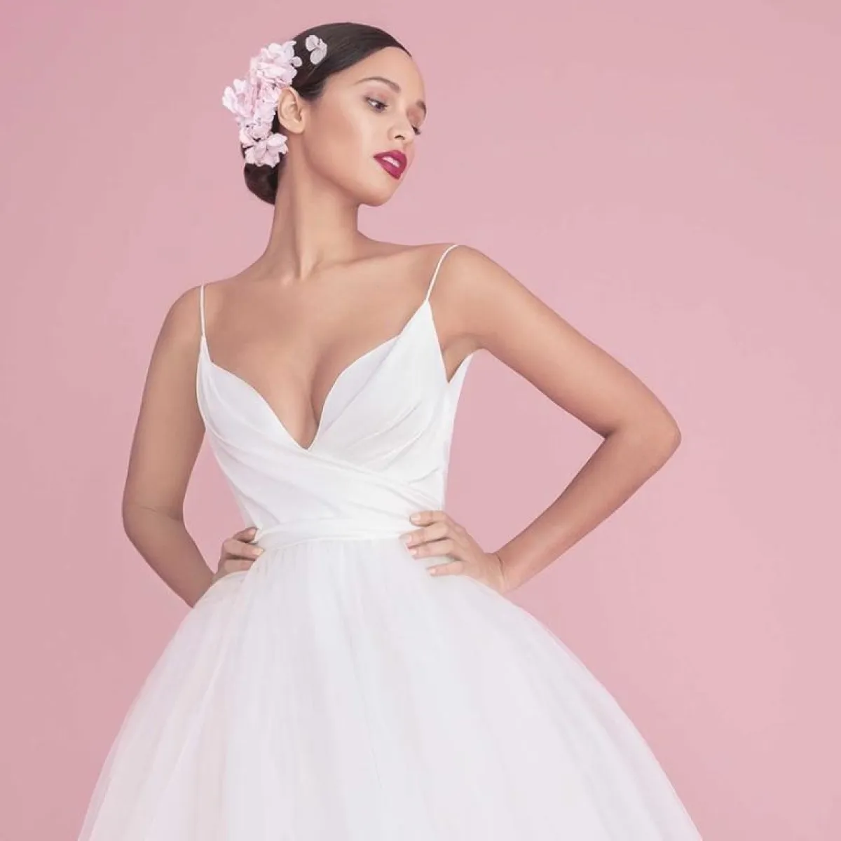 أما في إطلالة عروس Blush by Hayley Paige فظهرت الورود على هيئة إكسسوار جانبي ناعم مع تسريحة الشينيون.