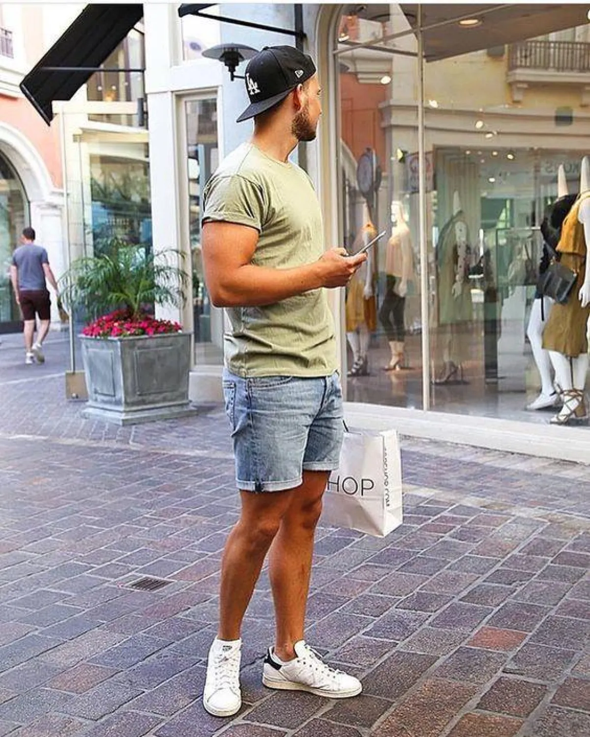 اخترنا لك الشورت الجينز، فهو الخامة الأهم على الإطلاق، يناسب التيشرت أو القميص الكاجوال. اخترنا لك إطلالة بالشورت مع التيشرت الزيتوني فاتح اللون، والقبعة الكاجوال، والحذاء الكاجوال الأبيض.